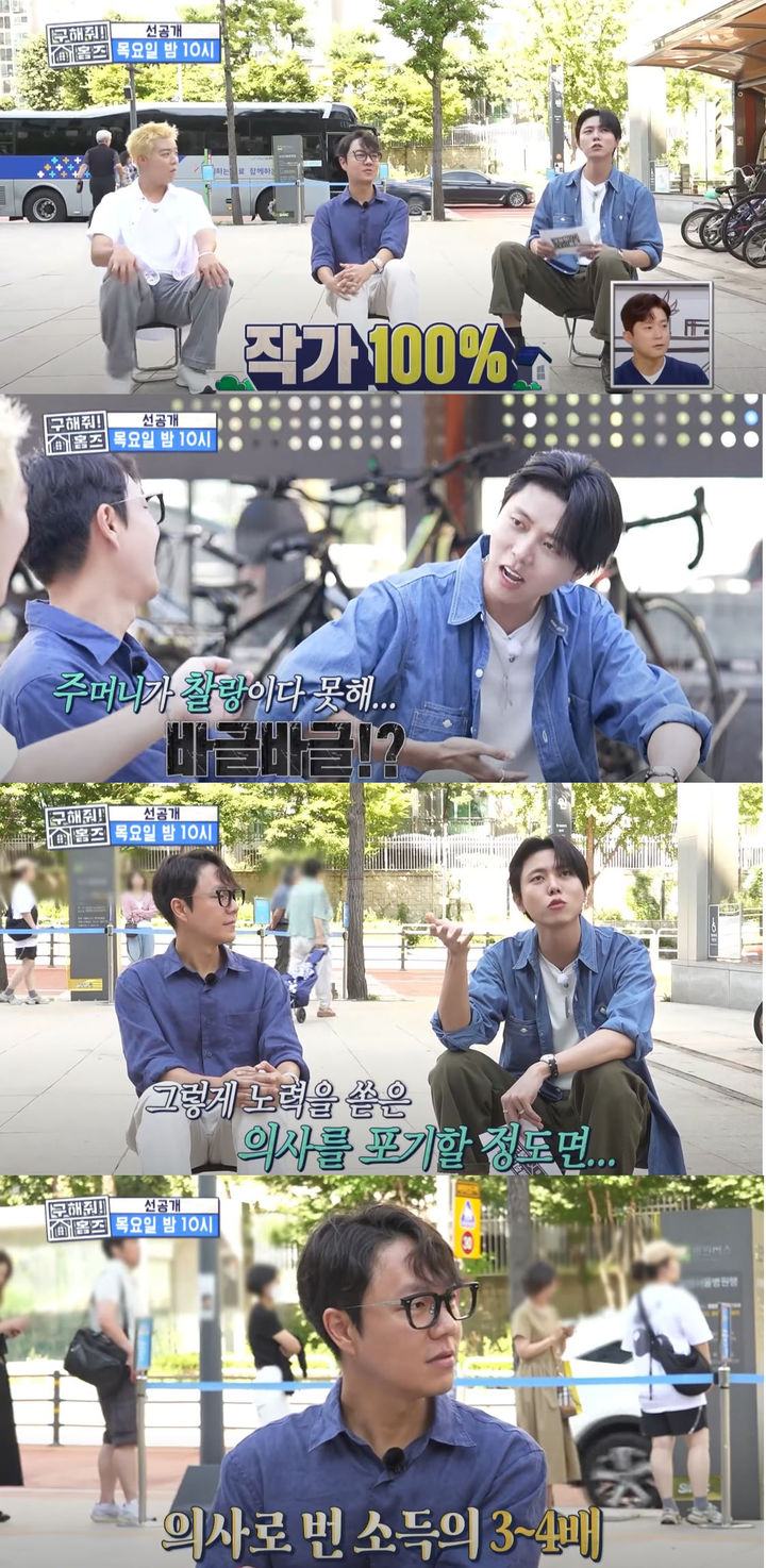 [서울=뉴시스]이비인후과전문의겸작가이낙준이지난9일방송한MBCTV예능프로그램'구해줘홈즈'에출연해방송인강남·주우재와임장에나섰다.(사진=MBC'구해줘홈즈'캡처)[email protected]*재판매및DB금지[서울=뉴시스]신지아인턴기자=이비인후과전문의겸작가이낙준이작가활동수입을공개했다.그는지난9일방송한MBCTV예능프로그램'구해줘홈즈'에출연해방송인강남·주우재와임장에나섰다.앞서주우재가"의사면서작가인데어느쪽비중이더높냐"고물었다.이낙준은"완전작가쪽에치우쳐있다"며"진료안한지5년정도됐다"고답했다.강남이"수입이몇배차이냐"고질문하자이낙준은"좀차이가난다.제가의사활동을레지던트·군의관·페이닥터순으로해봤다"고말했다.주우재가"그기간이엄청힘든데도불구하고그걸놓을정도면수입이좋다는거아니냐"고덧붙였다.이에이낙준은"'중증외상센터'전에도웹소설수익이나쁘지않았다"며"의사로벌때보다3~4배정도된다"고말했다.한편이낙준은올해1월공개한넷플릭스시리즈'중증외상센터'원작자로,동명웹소설을지난2019년연재했다.☞공감언론뉴시스[email protected]©뉴시스.무단전재및재배포금지.