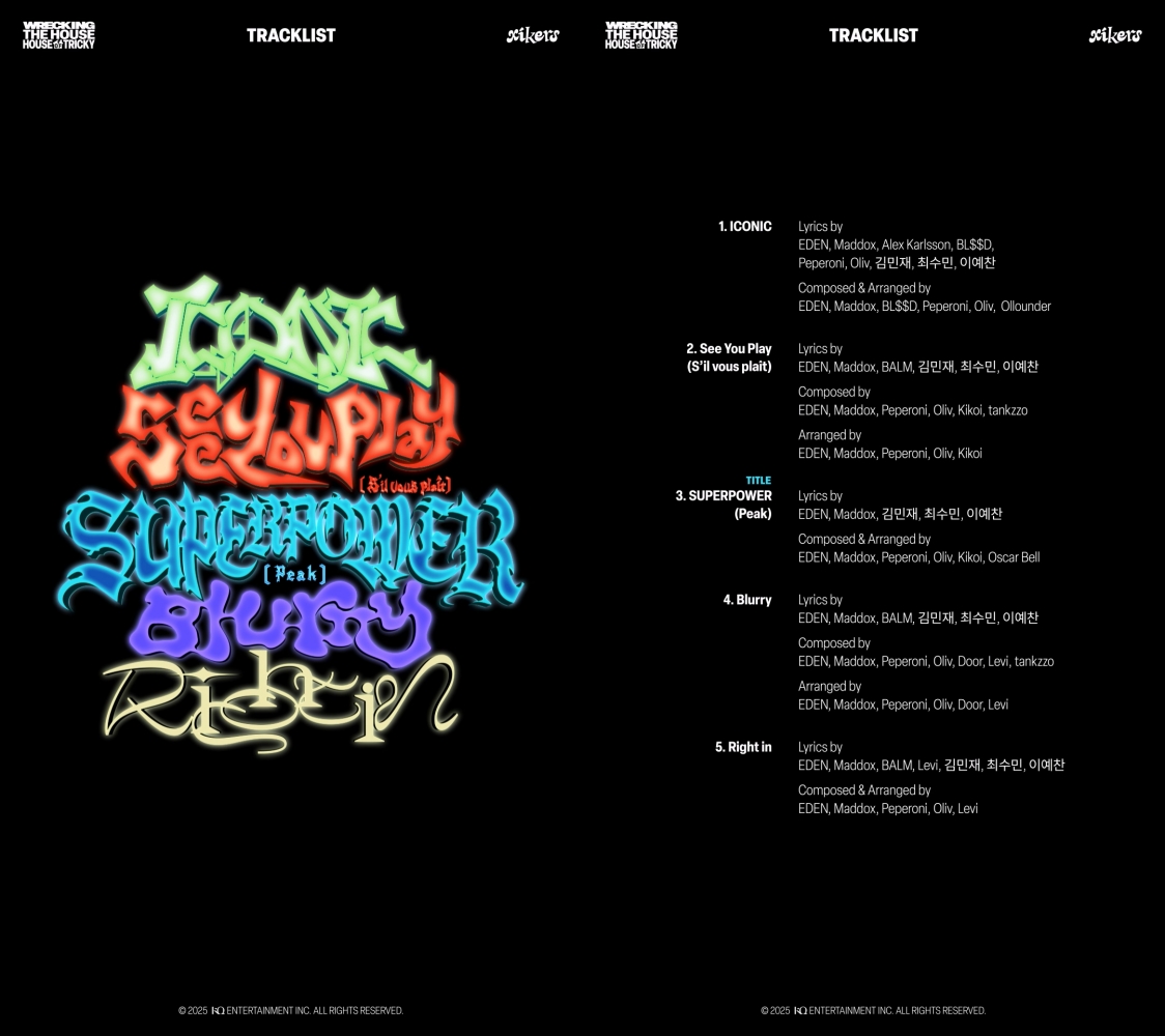 그룹싸이커스(xikers)가새미니앨범트랙리스트를공개했다.소속사KQ엔터테인먼트는14일0시공식유튜브채널을통해미니6집'HOUSEOFTRICKY:WRECKINGTHEHOUSE(하우스오브트리키:레킹더하우스)'의트랙리스트영상을게재했다.영상에는어둠속에서수록곡명이차례로등장하며,사이버펑크분위기의그래픽과네온조명이사용됐다.앨범에는타이틀곡'SUPERPOWER(Peak)'를비롯해지난8월공개된'ICONIC(아이코닉)','SeeYouPlay(S'ilvousplait)','Blurry','Rightin'등총5곡이담겼다.멤버민재,수민,예찬은전곡작사에참여했다.세사람은이전미니5집에서도작사진으로이름을올린바있다.이번앨범은데뷔때부터이어온'하우스오브트리키'시리즈의연장선이다.싸이커스는약7개월만에새작품을발표하며기존서사를잇는다.싸이커스의미니6집'HOUSEOFTRICKY:WRECKINGTHEHOUSE'는10월31일오후1시발매된다.[사진=KQ엔터테인먼트]YTNstar곽현수([email protected])*YTNstar에서는연예인및연예계종사자들과관련된제보를받습니다[email protected]로언제든연락주시기바랍니다.감사합니다.[저작권자(c)YTN무단전재,재배포및AI데이터활용금지]Copyright©YTN.무단전재및재배포금지.