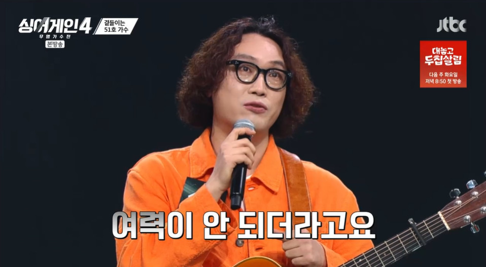 JTBC‘싱어게인-무명가수전시즌4’캡처JTBC‘싱어게인-무명가수전시즌4’캡처[뉴스엔장예솔기자]대한민국인디밴드1세대참가자가등장했다.10월14일첫방송된JTBC'싱어게인-무명가수전시즌4'(이하'싱어게인4')에서는치열한경쟁률을뚫고본선에진출한81인이공개됐다.'재야의가수'조51호가수를소개하는특이사항칸에는델리스파이스,언니네이발관과함께한국인디밴드1세대로유명하다는소개가적혀있었다.김이나는"나이분누군지알것같다"며반가워했고,다른참가자들역시51호를향한팬심을고백했다.51호가수얼굴을확인한윤종신은"이거좀반칙아니냐.너무실력파가수가나오셨다.그냥고수가나오셨다"고놀라워했다."나는곁들이는가수"라고자신을소개한51호가수는"'홍대인디밴드'라는말이시작될때1세대팀으로시작했다.매번새로운음원을내고사람들을만나고싶을때여력이안되더라.생각외로기회가많지않았다"고털어놨다.이어"노래하고연주하고싶어도그럴공간이없고사람들을직접만날수없었다.일상이반복되고스스로의활동안에갇혀있다는느낌이들었다.이제는저자신을알릴수있도록열심히활동할것"이라며'싱어게인4'에출전한이유를밝혔다.또"용기를내고싶었는데'이렇게푸짐하고,거한잔칫상에내가어울릴까?'라는생각이들더라.근데잔칫상에갈비찜만있는게아니라곶감,대추도올라가지않나.메인디시는아니더라도단1%인지도,단1%호감도를얻고싶다.또다른내년을맞이하고싶다"고바람을드러냈다.한영애의'코뿔소'를선곡한51호가수는총6어게인을받아2라운드에진출했다.뉴스엔장예솔imyesol@기사제보및보도자료[email protected]ⓒ뉴스엔.무단전재&재배포금지Copyright©뉴스엔.무단전재및재배포금지.