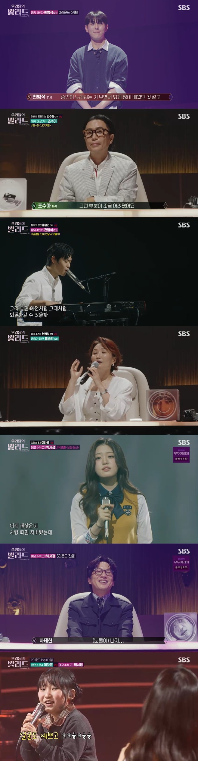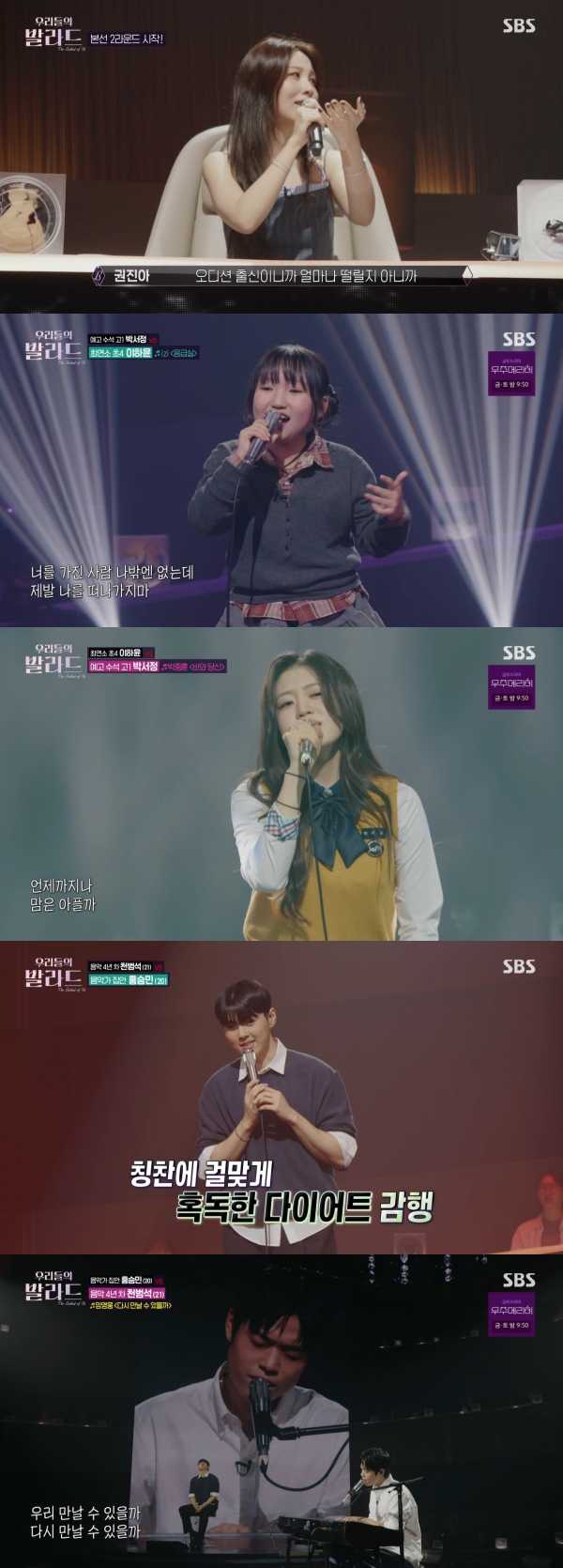 사진=SBS[스포츠투데이김태형기자]예고수석박서정,음악4년차천범석,그리고민수현이3라운드에진출했다.14일방송된SBS'우리들의발라드'에는권진아가크러쉬를대신해탑백귀로참여한가운데,1대1데스매치형식의2라운드가펼쳐졌다.이날참가자들은첫사랑,이별,OST등다채로운키워드속하나를골라키워드에맞는발라드곡으로무대에올랐다.두참가자중한참가자는탈락하는방식이었다.MC전현무는"오늘크러쉬씨가워낙예전부터잡힌일정이있어서함께하지못했다.대신권진아씨가오셨다"고말했다.권진아는'K팝스타3',정승환은'K팝스타4'출신이다."'K팝스타'출신두분이나란히계신다"라는말에정승환은"권진아씨가선배다"라고했다.전현무가"정승환씨처음나왔을때참가자의기분이아직남아있다고했는데"라고하자,권진아는"저도완전그렇다.너무감회가새롭고기분이이상하더라.오디션출신이다보니얼마나떨릴지아니까어떤심사를해야할지잘모르겠더라.그래도열심히해보겠다"고밝혔다.먼저최연소참가자초등학교4학년이하윤과예고수석고등학교1학년박서정이대결을펼쳤다.이하윤은드라마'쾌걸춘향'OST이지의'응급실'을선곡했다.MC전현무는"하윤양이2015년생인데이드라마가2005년방영이다"라며놀라워했다.이하윤은"사실이곡이이해가잘안돼서몰입이힘들었다"고토로했다.그는"연락을안하고기다리기만하는게제가봤을때는답답하더라"라고말했다.이에차태현은"그거다.답답한사람이문자하면되는건데"라고,정재형은"우리보다낫다"고반응했다.이하윤은"후렴에'이바보야진짜아니야'라는가사가있는데스토리를보면남자가여자한테하는말이다.그런데저는그오빠를보면서'그렇게하면안된다'고얘기한다고생각했다.그런방법이있었다"며웃었다.이하윤은어린나이답지않은가창력으로모두를놀라게했다.차태현은"청소년드라마OST를듣는듯했다"고말했고,전현무는"고음이정말깨끗하고듣기좋다"고평가했다.다음으로박서정은영화'라디오스타'OST박중훈의'비와당신'을선곡했다.그는박중훈의투박한느낌과는달리맑은목소리로무대를소화했다.차태현은"얼굴을보는데미소를띠면서가사는그렇지않은데괜찮은표정으로부르는모습이더막슬프다"고말했다.전현무는"기권"을외쳤다.정재형은"나는연기로봤다.벌스부터후렴까지자기영화를찍고있었고어느순간노래할때온몸에힘을쫙빼서그게정말최고였다.몸에힘을빼는게얼마나힘든지우리는아는데"라고칭찬했다.이에차태현은"우리도안다"며정재형이음악팀과예능팀으로편을가르는것을꼬집었다.정재형이"혹시아냐"고묻자차태현은"왜자꾸선을긋냐"며불만을제기했다.전현무도"내가힘한번빼봐?"라며바로몸에힘을빼웃음을안겼다.권진아는"가수는음색이다인것같다.음색이너무너무보물같다"며"원석을더다듬으면정말대단한가수가될것같다"고전했다.첫번째대결의결과는박서정의승리였다.박서정은85대64,21표차로3라운드에진출했다.그는"하윤이랑같이노래할수있어서진짜좋았고영광이었다.오늘솔직히저는포기하고부르긴했는데,다알아봐주시고투표해주셔서감사하다"고소감을밝혔다.그러면서참았던눈물을쏟았다.이에이하윤은"괜찮아.울지마"라며안아주는의젓한모습을보였다.차태현은"하윤이도속상할텐데대견하다"며감탄했다.다음으로음악가집안홍승민(20)과음악4년차천범석(21),'고막남친'들의대결이펼쳐졌다.먼저홍승민은2라운드를위해남다른노력을했다며"제가예전에1년반만에42kg을뺀적이있다.1라운드에서'고막남친'이라는코멘트를받아서말씀해주신것에걸맞게혹독하게4kg정도를감량해서외모도노력을했다"고밝혔다.그는"제가예전에이성친구한테불러주면서고백한적있는노래다"라며성시경의'영원히'를선곡했다.그는고백에성공했었다고말해기대를모았다.박경림은"오늘고막남친으로쐐기를박겠다.듣기전인데합격이다"라고말해웃음을자아냈다.홍승민은지난번무대에서정재형의지적을떠올리며"성악을했을때발라드같다는평을받았어서1라운드피드백을받고혼란스러웠는데이번에'영원히'를준비하면서무거워진소리를가볍게바꾸고일정한비브라토를중점적으로연습했다"고밝혔다.홍승민은감미로운목소리로담백하게무대를소화했다.그의무대를본미미는"여심저격완료"라며"초반에첫소절부르시는데심장이벌렁벌렁하더라.어쩌다눈이마주치는데마치고백받는것같았다.고백하셨던주인공이된것같은기분이들면서아주홀딱반해버렸다"고극찬했다.전현무도"남자인나도반할정도였다"고말했다.사진=SBS천범석은임영웅의'다시만날수있을까'를선곡했다.그는"저희어머니가임영웅의보컬을좋아하시는데곡을틀어놓으셨을때제가듣고멜로디가너무좋아서작곡하신분을찾아봤는데제가좋아하는뮤지션이적님이시더라"라고밝혔다.이에전현무는"요즘이적형이왜이렇게흐뭇하게다니나했더니이노래를작곡하셨군요"라고반응했다.정재형이"(이적이)저녁을너무사준다"고하자,전현무도"나도얼마전에호텔에서밥을사주더라"라고밝혀눈길을끌었다.천범석은피아노연주와함께멋진무대를펼쳤다.그는유니크한음색과수준급의피아노실력으로박수를받았다.전현무는"저는입덕하겠다"며"독보적인음색이다.음색도음색이고'