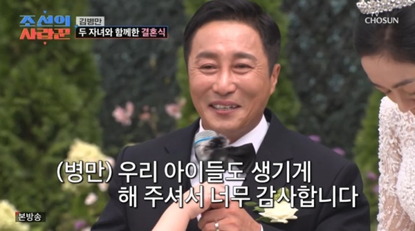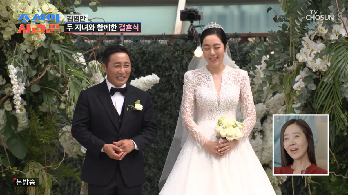 사진=TV조선'조선의사랑꾼'방송캡처(엑스포츠뉴스장주원기자)김병만이결혼식에서장인과장모에게진심을전했다.20일방송된TV조선'조선의사랑꾼'에서는김병만이결혼식을올리는모습이공개됐다.이날드디어결혼식을올리는김병만은결혼30분전,대기중인결혼식사회자이수근을향해발걸음을돌렸다.사진=TV조선'조선의사랑꾼'방송캡처20년지기절친인두사람은이야기를주고받으며추억을회상하며화기애애한분위기를자아냈다.김병만은"내가진짜부탁하고싶은게있다.부모님께인사하는거하지말아달라고하셨는데니가얘기를해서유도를해줬으면좋겠다"며사회자이수근에게부탁했다.오래기다려주신부모님께인사를드리고싶다는김병만의말에이수근은"오늘은축복받는날인데미안한게어디있냐.지금부터는행복하게사는모습만보여드려라"라고전하며조언을건넸다.사진=TV조선'조선의사랑꾼'방송캡처그렇게결혼식이시작되고,많은사람들의축하를받으며두부부는서약을주고받았다.김병만은"이순간을함께할수있는것은혼자서는빠져나올수없는깊은절망에서나를다시일으켜세워준당신이있었기때문이다.고난과역경들은당신을만나행복을되찾기위한과정이었음을깨달았다"며눈물과함께아내를향한마음을전했다.이어김병만의아내는"우리가처음만났던2006년봄날부터다시만나기까지16년이라는세월이흘렀고,20년에가까운오랜기다림이지나고나서야오늘이자리에당신과서있다.이제는특별하고멋진하루보다평범한일상을함께할수있다는것에감사하다"며김병만을향한마음을드러내흐뭇함을자아냈다.사진=TV조선'조선의사랑꾼'방송캡처눈물의서약식이끝난다음,이수근은김병만이부탁한미션을성취하기위해"저는개인적으로신부님아버님이야기가듣고싶다"며장인어른에게마이크를넘겼다.장인어른은"그동안마음고생엄청했는데,나는큰아들얻는다고생각하고가족같이편하게건강하게살자.그리고딸도마음고생다내려놓고행복하게살아"라며덕담을전해눈물을자아냈다.사진=TV조선'조선의사랑꾼'방송캡처김병만은"정말우리은재를잘키워주셔서돌아돌아결국저에게이렇게선물을해주셔서너무..."라며차마말을잇지못하고눈물을보였다.하객들의박수에힘입어다시말을이은김병만은"저에게는없을줄만알았던우리아이들도생기게해주셔서너무감사합니다"라며절과함께장인·장모님을향한감사함을드러내보는이들을먹먹하게만들었다.사진=TV조선'조선의사랑꾼'장주원기자[email protected]©엑스포츠뉴스.무단전재및재배포금지.