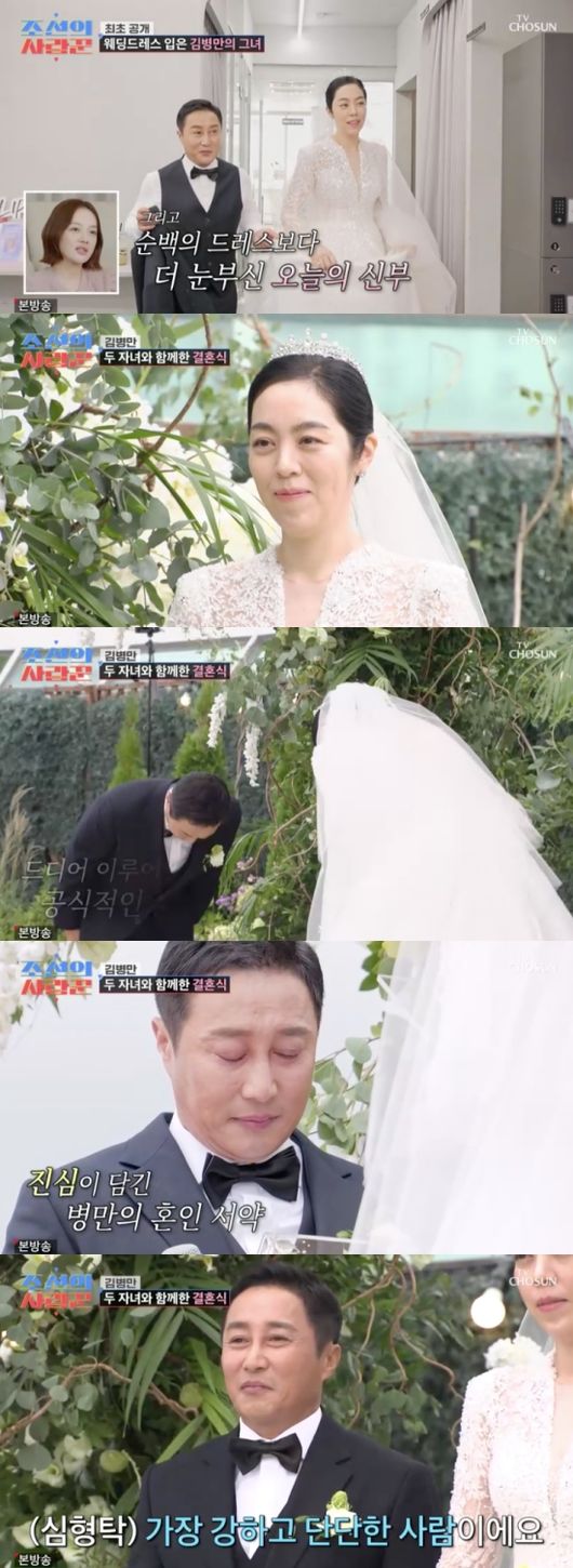 방송시청후작성된리뷰기사입니다.[OSEN=임혜영기자]김병만이세상가장행복한신랑이되었다.20일방송된TV조선‘조선의사랑꾼’에서는김병만부부의결혼식현장이그려졌다.김병만부부는김병만이직접꾸민버진로드에서결혼식이진행되었다.김병만의결혼식에는연예인들이총출동,역대급하객으로눈길을끌었다.결혼식사회에는절친이수근이나섰다.두사람은데뷔부터함께한25년지기.이수근은“진짜고생많이했다.키가안큰게아니라억눌려서다.세상에억눌려서.무거운짐을다떠안고사는것이다”라고김병만을아끼는마음을드러냈다.하객들이자리를잡고,드디어결혼식이시작되었다.장난치던모습을싹없애고김병만은긴장가득한모습을보였다.아내는두자녀와함께입장할준비를했고,귀여운아이들의모습에여기저기서웃음이터져나왔다.김병만부부는혼인서약서를읽으며눈물을쏟아냈다.많은이들의축하가이어진후김병만은자신이마이크를잡고장인,장모에게감사의마음을전했다.김병만은“은재를잘키워주셔서,돌아돌아서결국저에게선물을해주셔서너무감사하다.저에게는없을줄만알았던우리아이들도생기게해주셔서너무감사하다”라며눈물을흘렸다.그리고큰절을올렸다.김병만의아내또한“나도귀한딸인데너무감사하고고맙다”라며묵묵하고따뜻한응원을함께해준부모님에게고마운마음을전했다./[email protected][사진]TV조선‘조선의사랑꾼’Copyright©OSEN.무단전재및재배포금지.