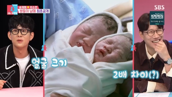SBS‘동상이몽2너는내운명’SBS‘동상이몽2너는내운명’[뉴스엔유경상기자]송재희지소연부부가쌍둥이남매를최초공개했다.10월20일방송된SBS‘동상이몽시즌2-너는내운명’에서는송재희지소연부부의쌍둥이출산과정이공개됐다.송재희지소연부부의쌍둥이는첫째가아들로3.25kg이었고둘째가딸로2.43kg이었다.쌍둥이지만몸무게차이가꽤나는상황.송재희는감동의눈물을흘리며아내지소연에게“고생했다”고말했고,지소연은“나고생했지.잘키웠지”라며함께눈물흘렸다.이어송재희는쌍둥이를안고함께사진을찍었고,쌍둥이지만몸무게가다른아들딸이얼굴크기도확연한차이를보여눈길을끌었다.김구라는“첫째얼굴이나랑비슷하다”고말했고조우종이“왜악담을하냐”고응수하자김구라는“왜악담이냐.내가옛날에얼마나귀여웠는데”라고주장했다.김숙은김구라얼굴에“신생아얼굴이있다”고수습했고,손민수도김구라가“신생아상”이라고말했다.(사진=SBS‘동상이몽2너는내운명’캡처)뉴스엔유경상yooks@기사제보및보도자료[email protected]ⓒ뉴스엔.무단전재&재배포금지Copyright©뉴스엔.무단전재및재배포금지.