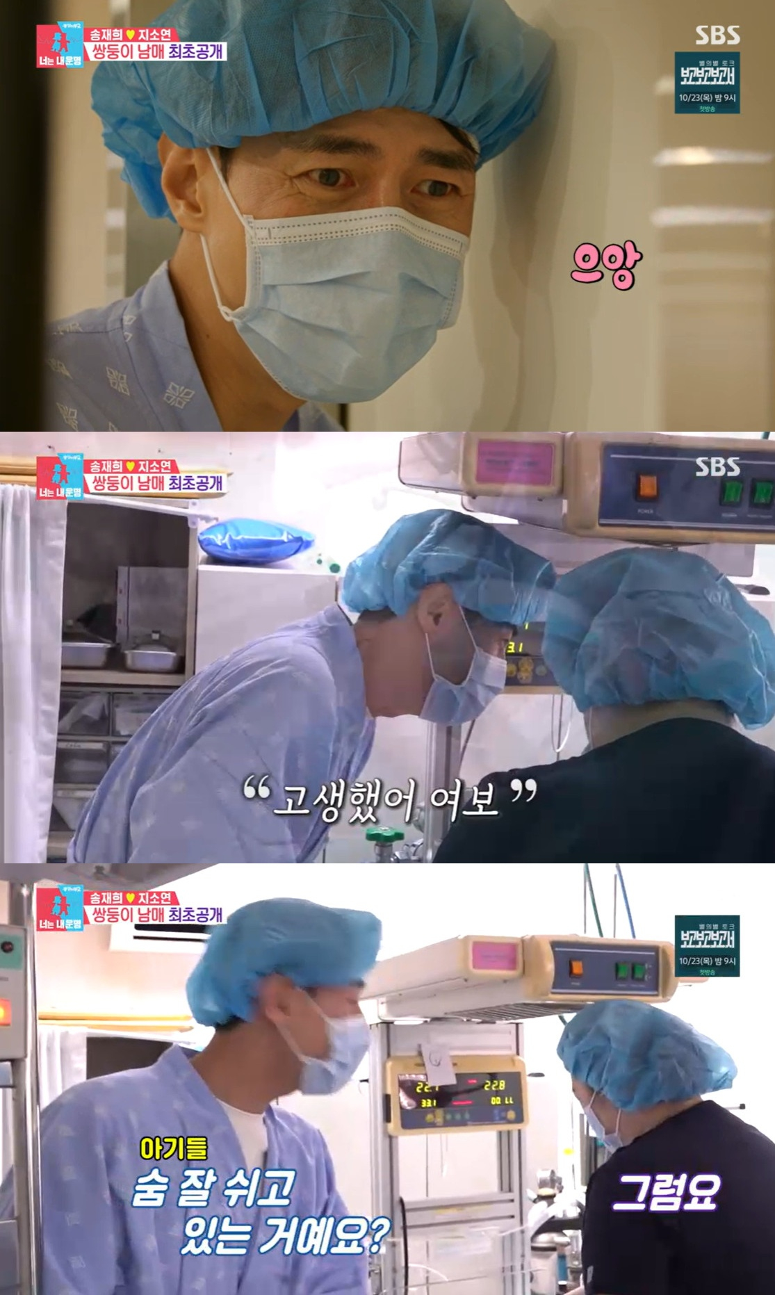 [스타뉴스|안윤지기자]/사진=SBS예능프로그램'동상이몽2'방송캡처'동상이몽2'배우송재희,지소연부부가쌍둥이남매의부모가됐다.20일방송된SBS예능프로그램'동상이몽2-너는내운명'에서는송재희,지소연부부의일상이공개됐다.이날지소연은쌍둥이출산하는날이됐다.송재희는"마지막만찬먹어야한다"라며삼겹살을구웠다.지소연은"못먹을거같다"라고하자,송재희는"첫째낳기전날마지막으로뭘먹고싶냐니까삼겹살을먹고싶어했다.그래서했다.임산부니까완전익혀먹어야한다"라고꿋꿋하게구웠다.지소연은헛구역질하는모습을보였지만,송재희는계속요리했다.김숙은"사람은착한데눈치가없다"라고꼬집었다.지소연은"배가완전무겁다.아기들무게만5kg다돼갈거같다.다들쌍둥이임신을어떻게했냐.하엘이땐날아다녔는데..."라고호소했다.김구라는"힘들다고한풀이하고있는데저걸왜하고앉아있냐.부담스러워서먹겠냐?"라고타박했다.병원에도착한지소연은끊임없이고통을호소했고,결국수술시간을앞당겨진행했다.30분의시간이지난후,첫째아들,둘째는딸이었다.송재희는무사히쌍둥이남매가나왔다는걸알고안도감에눈물을흘렸다.그는"첫째나오기전에병원에갔다.아이를낳을확률이1%도안된다고했다.근데저날셋이된거아니냐"라고감탄했다.한편'동상이몽2'는매주월요일오후10시10분에방송한다.안윤지기자[email protected]©스타뉴스&starnewskorea.com,무단전재및재배포금지