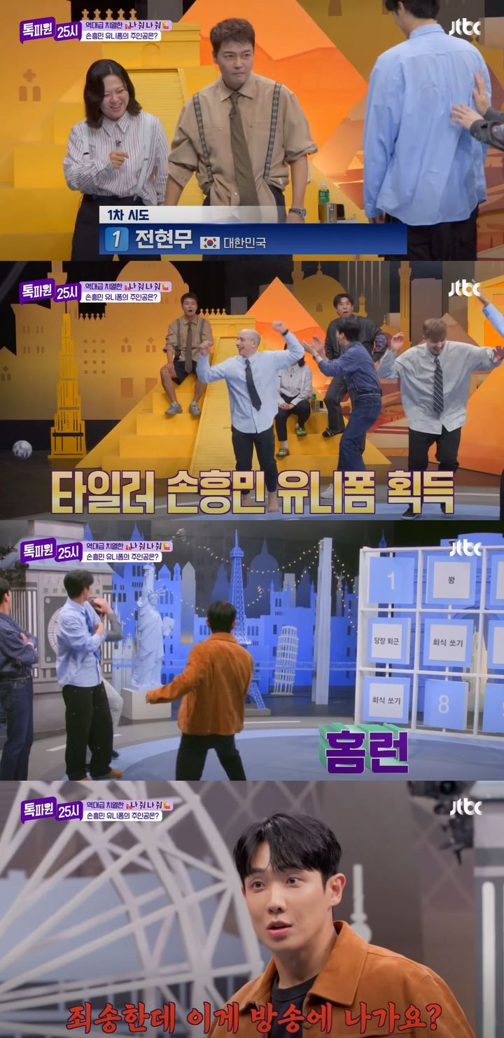 [서울=뉴시스]그룹엠블랙출신배우이준이지난20일방송한JTBC예능프로그램'톡파원25시'에게스트로출연했다.(사진=JTBC'톡파원25'캡처)[email protected]*재판매및DB금지[서울=뉴시스]신지아인턴기자=그룹엠블랙출신배우이준이축구선수손흥민유니폼을걸고출연진과승부를펼쳤다.그는지난20일방송한JTBC예능프로그램'톡파원25시'에게스트로출연했다.출연진은유니폼이공개되자환호했다.양세찬은"미국냄새가난다"고말했다.이어출연진은빙고판에축구공을차상품을얻는게임을진행했다.전현무가준비하자양세찬은"개발이니까감독님들조심하셔야된다"고했다.전현무는공을찼고,'당장퇴근'을뽑았다.출연진은전현무를스튜디오밖으로밀어냈다.타일러는'손흥민어센틱유니폼'이나왔고,그는만세포즈를취했다.다음차례로이준이공을차자촬영장밖으로나갔다.양세찬은"우리살림다부실거냐"고했다.이준은"이게방송에진짜나가는거냐.우리끼리노는것같다"고말했다.☞공감언론뉴시스[email protected]©뉴시스.무단전재및재배포금지.