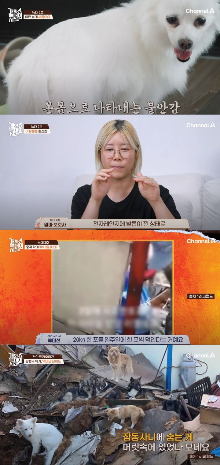 [서울=뉴시스]지난21일방송한채널A예능프로그램'개와늑대의시간'에선이른바'천안트라우마견'사연이공개됐다.(사진=채널A'개와늑대의시간'캡처)[email protected]*재판매및DB금지[서울=뉴시스]신지아인턴기자=반려견이보호자가없을때1시간동안서있기만하는이유가공개됐다.지난21일방송한채널A예능프로그램'개와늑대의시간'에선이른바'천안트라우마견'사연이공개됐다.앞서반려견은보호자가나가자현관앞에서계속서있었다.보호자는"나가면눕지도않고그냥서있다"며"너무안움직여서홈캠이꺼진적도있었다"고덧붙였다.보호자는"어느날은전자레인지에발톱이껴서발버둥치다가식탁밑으로떨어져서발톱이통째로빠졌었다"고말했다.강형욱은소리를지르며"저건좀보기힘들다"고했다.이어보호자는"입양전2020년에구조된걸로알고있다.고물상같은곳에서애니멀호더(동물을과도하게데려와방치하고학대하는사람)가데리고있었다"고말했다.실제반려견이있었던장소를촬영한영상에선많은강아지가열악한환경에놓여있는걸확인할수있었다.구조자는"전체가쓰레기더미였다.그마당에사료를뿌리면애들이허겁지겁주워먹는걸봤다.돈이없어서사료20㎏을일주일에한번만준다더라"라고했다.그는"항상고함지르고발로차서애들을겁줬다.강아지수가늘어나니까사료에농약을타서일부러죽였다.사체를마당에던져놔서살아남은나머지강아지는그모습을다본거다"라고말했다.이를본강형욱은"높은데로올라가서숨는개가많지않은데잡동사니에숨어있던게머릿속에있었던것같다"며"보호자가없어지는순간엔다시예전기억으로돌아가는거다"라고했다.☞공감언론뉴시스[email protected]©뉴시스.무단전재및재배포금지.