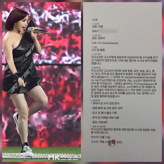 걸그룹2NE1출신가수박봄이이번엔전소속사YG엔터테인먼트와양현석대표를상대로고소장을공개해파문을일으켰다.22일박봄은자신의SNS에“From박봄”이라는글과함께직접작성한고소장을게재했다.고소장에는피고소인을양현석으로지정하고,“YG엔터테인먼트가정당하게지급되어야할수익금을장기간지급하지않았다”며‘사기및횡령’혐의로법적처벌을요구하는내용이담겼다.걸그룹2NE1출신가수박봄이이번엔전소속사YG엔터테인먼트와양현석대표를상대로고소장을공개해파문을일으켰다.사진=천정환기자,박봄SNS박봄은“국민여러분,YG엔터가나에게한일을조사해달라”고호소하며“정산내역도제공받지못했고,단한차례의정당한지급도없었다”고주장했다.이번폭로는박봄이배우이민호를향해‘내남편’이라언급한SNS발언,그리고정신건강문제로활동을중단한이후이어진또한번의논란이다.일각에서는박봄의주장이실제분쟁인지,아니면최근이어진돌발발언처럼혼란스러운심리상태에서비롯된것인지우려의목소리도나온다.한편,박봄은지난8월건강문제로활동을중단했으며,2NE1멤버들과의재결합이후에도예기치못한행동으로화제를모은바있다.[김승혜MK스포츠기자][ⓒMK스포츠,무단전재및재배포금지]Copyright©MK스포츠.무단전재및재배포금지.