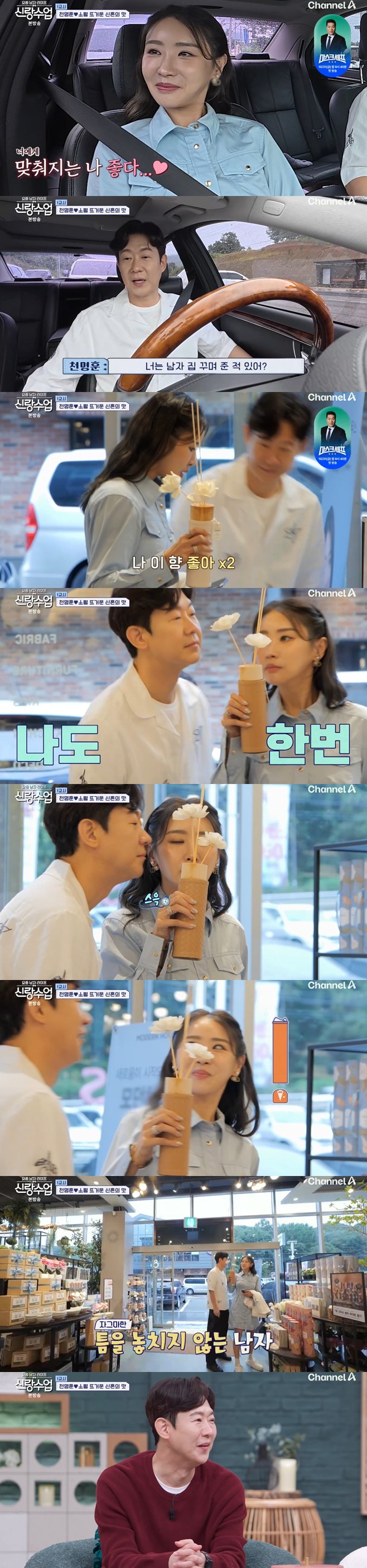 티브이데일리포토[티브이데일리이기은기자]천명훈,소월에푹빠졌다.11일밤방송된채널A예능프로그램‘요즘남자라이프신랑수업’에서는천명훈소월연애과정이공개됐다.이날천명훈은소월을공주님처럼모시면서쇼핑몰에그를데리고갔다.비가많이내리는날이었기에천명훈은평소실내쇼핑을좋아하는소월에게맞추기로한것.소월이너무좋은천명훈은조화에코를대고향기를맡는소월에게얼굴을들이대며키스를시도하는시늉을냈다.소월은깜짝놀라며얼굴을피했고,천명훈은“방심했어?”라며장난꾸러기처럼웃었다.꿀떨어지는신혼부부마냥집안소품을구경하는두사람사이에핑크빛기류가피어올랐다.결혼은시간문제일까.[티브이데일리이기은기자[email protected]][Copyrightⓒ*세계속에新한류를*연예전문온라인미디어티브이데일리(www.tvdaily.co.kr)/무단전재및재배포금지]Copyright©티브이데일리.무단전재및재배포금지.