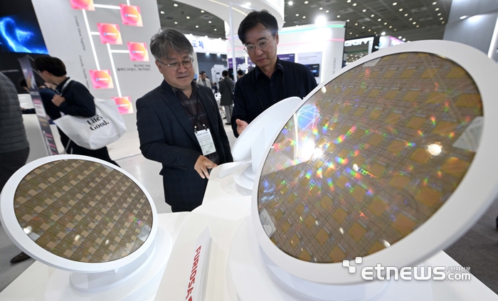 인공지능(AI)을향한반도체업계의도전이시작됐다.설계부터제조,후공정까지전과정에서AI반도체를업그레이드하기위한기술고도화가진행됐다.22일서울코엑스에서개막한'반도체대전(SEDEX2025)'에서는고성능반도체구현솔루션들이대거공개돼관람객들로붐볐다.◇'빅다이·첨단패키징'기술총출동올해반도체대전의키워드는단연AI였다.전세계반도체시장을뒤흔들고있는AI를겨냥한기술들이눈길을끌었다.대표적으로'빅다이(Bigdie)'트렌드다.고성능구현을위해칩크기가점점커지면서설계와장비기술들이등장했다.삼성파운드리디자인솔루션파트너(DSP)인세미파이브는최대775제곱밀리미터(㎜²)에달하는칩설계기술을선보였다.범용반도체칩크기가수십㎜²인점을고려하면이는초대형칩이다.회사는이미10건이상의빅다이프로젝트도수행했다고강조했다.세미파이브관계자는“엣지AI용반도체는181㎜²,AI데이터센터용은400㎜²와500㎜²,3차원(3D)AI메모리는775㎜²인칩을모두수주했다”며“제조난도가높은빅다이를맞춤형으로설계할수있는국내유일기업”이라고강조했다.한국반도체산업협회가주최한제27회반도체대전이22일서울강남구코엑스에서사흘일정으로열렸다.세미파이브부스에서관람객이반도체웨이퍼기술에대한설명을듣고있다.김민수기자[email protected]한미반도체는빅다이에대응할수있는패키징장비'2.5D빅다이열압착(TC)본더'와'빅다이FC본더'를국내최초공개했다.각각120×120㎜,75×75㎜크기대형인터포저패키징을지원하는장비로AI반도체에서요구되는초대형칩과멀티칩집적을지원한다.회사는6세대고대역폭메모리(HBM4)용'열압착(TC)본더4'도선보여눈길을끌었다.한미반도체TC본더는HBM제조에필수장비로떠올라SK하이닉스외마이크론등에서사용하고있다.반도체성능을끌어올릴방법으로부상한패키징에서도첨단기술들이소개됐다.국내유일TSMC디자인파트너인에이직랜드는최첨단AI반도체에서요구되는2·3나노미터(㎚)와첨단패키징(CoWoS)대응역량을전시에서보여줬다.반도체신뢰성검사업체큐알티는AI반도체신뢰성검사를위한번인(Burn-in)테스트서비스를소개했다.회사는고신뢰성이담보돼야하는우주항공반도체를겨냥한방사선평가장비도전시했다.에이직랜드부스(사진:박진형기자)◇신사업확장나선기업들반도체산업이급성장하면서사업영역을넓히려는기업들의움직임도전시회에서엿보였다.켐트로닉스는제이쓰리를인수해실리콘웨이퍼재생에이어글라스캐리어웨이퍼재생으로사업을확장중이다.본딩·디본딩과정에서미세결함이생긴캐리어웨이퍼표면을켐트로닉스의유리가공기술을활용해복원하는방식이다.회사관계자는“글라스캐리어웨이퍼재생을위한파일럿라인을구축했고고객과평가를진행하는중”이라며“국내를시작으로해외시장을공략할것”이라고말했다.켐트로닉스부스에전시된재생웨이퍼(사진:이호길기자)동진쎄미켐은전공정소재포토레지스트(PR)뿐만아니라첨단패키징소재도소개했다.범프PR을양산공급한데이어기판내전류가흐르는회로간간섭을막는동진빌드업필름(DJBF)제품군을넓히고있다고설명했다.일본아지노모토가독점중인데동진쎄미켐은핵심성능지표인열팽창계수(CTE)와유전손실계수(Df)가낮은특화제품도갖췄다고강조했다.이외에도칩을평탄화하는화학기계적연마(CMP)공정에서사용되는슬러리,노광공정이후남은잔류범프PR을제거하는스트리퍼등의개발현황을공개했다.이외케이씨텍은CMP장비와슬러리를,원익IPS는화학기상증착(CVD)·원자층증착(ALD)장비를,피에스케이그룹은PR스트리퍼,디스컴·리플로우장비를내세웠다.김정회한국반도체산업협회부회장은“AI시대가반도체기업에요구하는것은어제의정답을반복하는것이아니라아무도가보지않은새로운길을여는혁신”이라며“SEDEX에소개된기술들은끊임없이한계에도전하는우리반도체기업들의결과물”이라고말했다.박진형기자[email protected],이호길기자[email protected]©전자신문.무단전재및재배포금지.