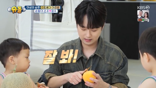 KBS2TV‘슈퍼맨이돌아왔다’KBS2TV‘슈퍼맨이돌아왔다’[뉴스엔유경상기자]이찬원이김준호보다육아살림고수의면모를보였다.10월22일방송된KBS2TV‘슈퍼맨이돌아왔다’(이하‘슈돌’)에서는펜싱금메달리스트김준호와아들은우,정우의집으로가수이찬원이찾아왔다.이찬원은은우,정우와첫만남부터바로포옹을받으며친해졌고이어김준호가서툴게복숭아를깎으려하는모습을보고대신칼을잡았다.최지우가“손이야무지다”고칭찬했다.정우는“진또배기삼촌,이것도잘라주세요”라며멜론도건넸고,이찬원은멜론도빠르게깎았다.김준호는“잘하기도하는데빨라서애들이시선을못떼더라”고감탄했다.김준호는이찬원이과일을깎아서아이들과함께먹는것을보고“결혼하면잘살것같다”며“미안하다.내가해줘야하는데”라고사과했다.이찬원은“너무웃기다.남의집에와서”라며웃었고박수홍은“저집만가면연예인들이혹사를당한다”고농담했다.김준호는“저희집에오시면평소에하지못한경험을많이할수있다.많이찾아와주세요”라고너스레를떨었다.(사진=KBS2TV‘슈퍼맨이돌아왔다’캡처)뉴스엔유경상yooks@기사제보및보도자료[email protected]ⓒ뉴스엔.무단전재&재배포금지Copyright©뉴스엔.무단전재및재배포금지.