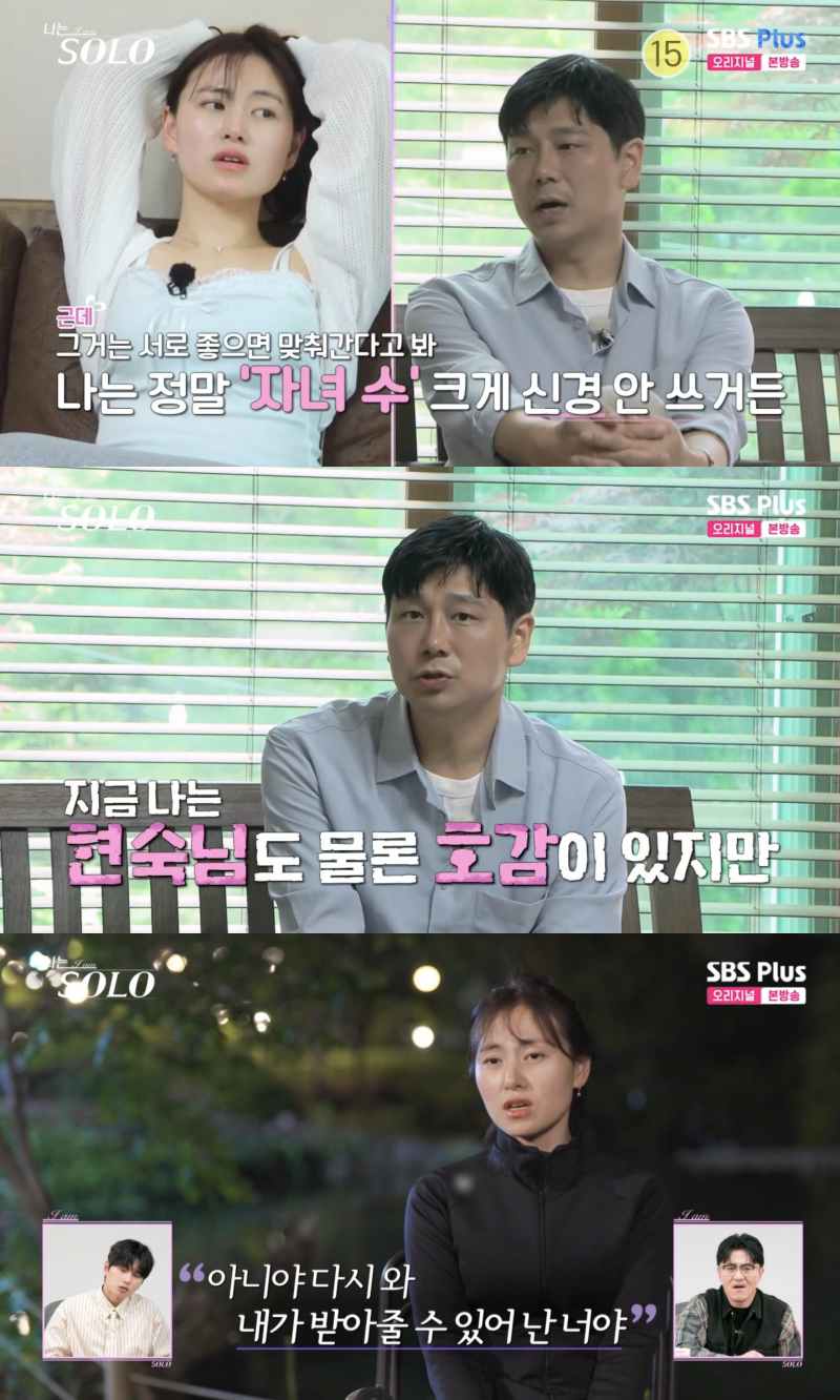 방송시청후작성된리뷰기사입니다.[OSEN=박근희기자]'나는SOLO’데프콘이영수의모호한'여지주는화법'에결국폭발했다.22일오후방송된SBSPlus와ENA의리얼데이팅프로그램‘나는SOLO’에서는결혼을간절히원하는28기솔로남녀들이모습이이어졌다.현숙은영수와의대화중눈물을글썽이며솔직한감정을털어놓았다.현숙은자녀가없는영수에게"너는이만큼줄수있는데나는이거밖에못줄것같아.나는지금좀힘든사람이야.근데너는멋지잖아"라고말하며,영수에게미안함과자신의상황에대한솔직한부담감을드러냈다.현숙은어제대화를통해영수가자신에게더높게느껴졌다고밝혔고,이에영수는"나그렇게대단한사람아니야"라고겸손하게답해눈길을끌었다.영수는현숙의고백에조심스럽게운을뗐다.영수는"혹시라도마음에그늘이있다면전혀신경쓰지말고현숙님이원하는사람찾고원하는거했으면좋겠어.지금나는현숙님도물론호감이있지만"이라고말했다.이어현숙의매력을알게된것같다고덧붙였다.하지만영수의애매한태도는MC들의답답함을유발했다.영수가"최종선택은현숙님마음이고마음이있다면적극적으로표현했으면좋겠어"라고말하자,데프콘은"이게뭐야?"라며당황했다.결국데프콘은"저버릇또나왔다"라고일침을가했고,이이경과송해나역시한숨을내쉬며영수의모호한화법에답답함을표했다.현숙은영수의반응에따라갈지말지를정할것이라고밝혔지만,영수는마지막까지"앞으로어떻게될지또모르겠어"라고모호하게답하며여지를남겼다.현숙은인터뷰를통해"와안망했다"라며긍정적으로해석했다.이에데프콘은"영수가말을개떡같이했다"라며현숙의해석에대해'큰일났다'는반응을보였다./[email protected][사진]‘나는SOLO방송화면캡쳐Copyright©OSEN.무단전재및재배포금지.