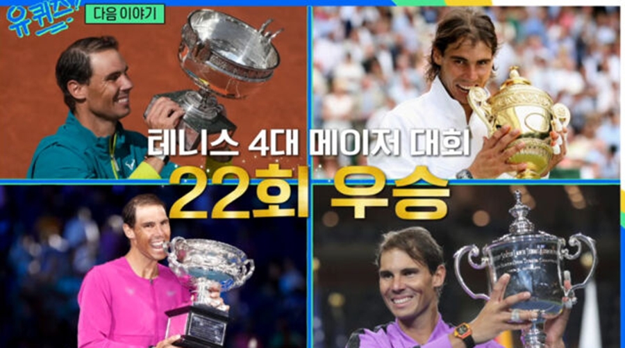 ▲라파엘나달.출처ㅣtvN방송화면[스포티비뉴스=강효진기자]세계적인테니스선수라파엘나달이'유퀴즈온더블록'에출연한다.23일오후방송된tvN예능프로그램'유퀴즈온더블록'(이하유퀴즈)말미에는다음방송출연자들에대한예고가담겼다.먼저캄보디아취업사기피해자를구한오영훈경정이출연해긴박했던이야기를전하고,tvN드라마'얄미운사랑'에출연예정인배우이정재,그리고지난해은퇴한테니스'흙신'라파엘나달이깜짝등장을예고해놀라움을자아냈다.라파엘나달은22일오후인천국제공항을통해방한했다.한편라파엘나달은2001년프로로데뷔한이후22번의메이저대회우승경력을가진세계적인테니스선수다.나달이'유퀴즈'를통해어떤이야기를전해줄지주목된다.<저작권자ⓒSPOTVNEWS.무단전재및재배포금지>Copyright©스포티비뉴스.무단전재및재배포금지.