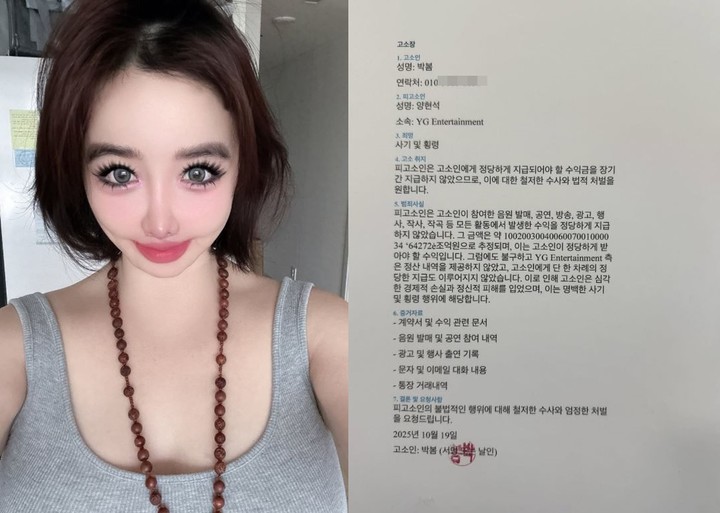 박봄소속사"YG,이미정산완료…양현석고소도NO""치료·회복전념"박봄인스타그램캡처(서울=뉴스1)황미현기자=그룹2NE1의박봄이양현석YG엔터테인먼트대표프로듀서를고소한다는내용의게시물을올렸지만,소속사측은사실아니라고했다.과거이민호가자신의연인이라고주장했던사안까지재차관심을받는가운데,많은팬들은박봄의건강을우려하며빠른회복을바라고있다.박봄은지난22일"프롬(From)박봄"이라는글과함께양현석을상대로한고소장내용을담은사진을게시했다.박봄이공개한'고소장'이라는적은종이에는고소인이박봄,피고소인이양현석으로쓰여있다."피고소인은고소인에게정당하게지급돼야할수익금을장기간지급하지않았으므로,이에대한철저한수사와법적처벌을원한다"라고고소취지가적혀있다.박봄은"피고소인은고소인이참여한음원발매,공연,방송,광고,행사,작사,작곡등모든활동에서발생한수익을정당하게지급하지않았다"라며"그금액은약1002003004006007001000034'64272e조억원으로추정되며,이는고소인이정당하게받아야할수익이다,그럼에도불구하고YG엔터테인먼트측은정산내역을제공하지않았고,고소인에게단한차례의정당한지급도이뤄지지않았다"라고주장했다.그러면서'이로인해고소인은심각한경제적손실과정신적피해를입었으며,이는명백한사기및횡령행위에해당한다"라고얘기했다.해당고소장에는박봄의연락처가고스란히공개되어있다.이에팬들은"언니제발내려라,연락처까지공개되어있고이건아니다"등의댓글을달았다.더욱이박봄이제시한금액이천문학적이자비현실적이라그를염려하는글이주를이뤘다.박봄은고소장을올린이후23일태연하게자신의일상사진을올렸다.박봄은인스타그램에"립스틱감사"라면서반려견사진을공개했다.반려견의입에분홍색립스틱이잔뜩묻은모습이다.양현석을고소하겠다는고소장을올린후너무나평온한일상을공개해놀라움을줬다.이후박봄의소속사디네이션엔터테인먼트측은이날오전"박봄의2EN1활동과관련된정산은이미완료되었으며,SNS에업로드한고소장은접수된사실이없습니다"라고알렸다.이어"박봄은모든활동을중단하고치료및회복에전념하고있습니다,당사는아티스트가건강을되찾을수있도록최선을다하겠습니다"라고덧붙였다.앞서박봄은지난해9월부터배우이민호와사귀고있다고주장해왔다.초반에는이민호측이공식입장을내지않았지만이런주장이몇차례이어지자,이민호는지난2월"개인적친분이없다"고공식입장을밝히기도했다.당시업계에서는"박봄의건강이좋지않다"라며"소속사에서도난처해하며,2NE1완전체활동에서도고충이많다,컨트롤이잘되지않고있다"고입을모았다.한편박봄은지난8월부터건강상문제로활동을중단중이다.이와관련당시소속사디네이션엔터테인먼트는"최근의료진으로부터충분한휴식과안정이필요하다는소견을받은만큼깊은논의끝에부득이하게이런결정을내리게됐다"라고전한바있다[email protected]©뉴스1.Allrightsreserved.무단전재및재배포,AI학습이용금지.