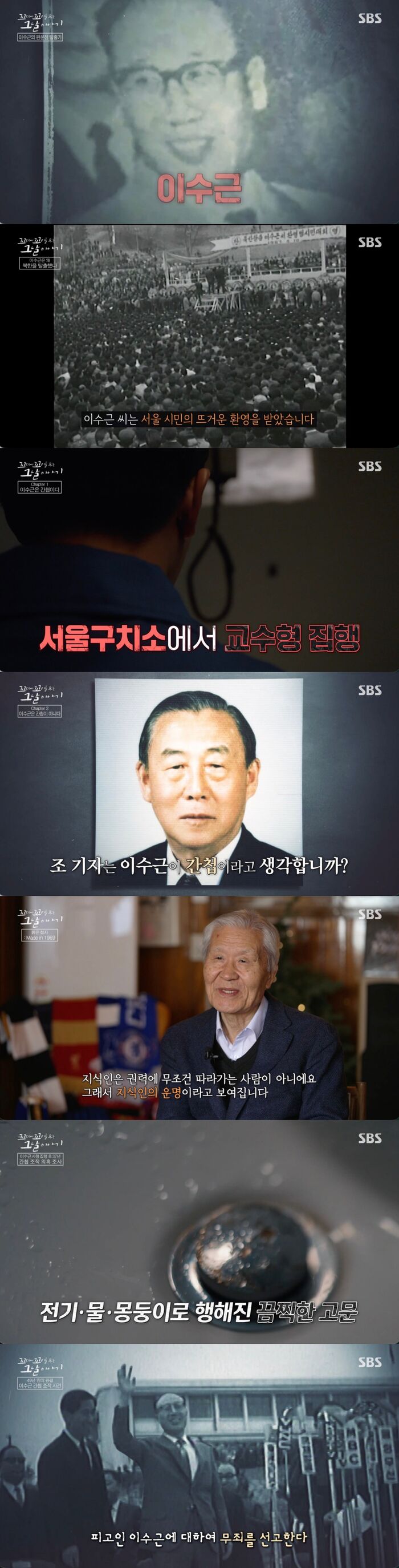 [SBS연예뉴스|김효정에디터]이수근,그는간첩이아니다19일방송된SBS'꼬리에꼬리를무는그날이야기'(이하'꼬꼬무')에서는'붉은첩자:Madein1969'라는부제로이중간첩으로사형을당한이수근에대한이야기가공개됐다.1967년3월22일,판문점공동경비구역(JSA).군사정전위원회회의가막끝난때에고급세단이북한국초소의차단기를들이받았다.세단을탄인물은조선중앙통신사의부사장이수근.북한의고위급언론인이남한으로귀순하기위해탈출극을벌인것이었다.그는서울시민들의뜨거운환영속에귀순에성공했다.시민들은그를'자유의용사'라칭송하며환영했다.그리고그는북한에있는가족과함께살수있게해달라눈물로호소했다.20년넘게김일성찬양기사를작성하며최고위급언론인이되었지만충성심을의심받고숙청위기에탈출결심한이수근.그의탈북사유를알게된시민들은이수근의가족들돌려보내달려며전국적인서명운동을했고두달만에130만명이서명했다.그런데순탄할줄만알았던그의삶에빨간불이켜졌다.이수근의탈북1년후,그의생사확인에대한괴전화가쏟아졌고사람들사이에그가간첩이라는소문이돌았던것.그리고얼마후이수근이감쪽같이사라졌다.이어1969년,이수근의탈북2년뒤그는위장귀순한이중간첩이라며체포되었다.판문점탈출은물론가족에대한그리움을호소한것모두거짓이라는이야기에시민들은분노했다.1968년북한의분노가극에달한사건들이연달아일어나며북에대한분노가가시기도전에이수근이이중간첩이라는사실이알려지며시민들의배신감은이루말할수없었던것이다.그렇다면이수근의진짜정체는무엇일까?자유의용사?아니면붉은첩자?이수근은수염과안경으로위장하고위조여권을들고비행기에올랐다.그리고그를도운아내의조카인배경옥.베트남에근무하다가한국에들어온배씨는이씨의요청으로이씨의위조여권을만들었고함께출국했다.이수근의정체를의심하며감시중이었던중앙정보부는이수근이행방불명됐다는사실에비상이걸렸다.당시김형욱중앙정보부장은전요원들을동원해이수근을추적했다.홍콩에서베트남으로이동하려던이수근과배경옥.김형욱중정부장은베트남에근무하고있던이대용공사에게연락을했고비행기의이륙을막아달라부탁했다.이에이대용공사는당시베트남대통령에게비행기이륙막아달라고부탁했고이륙하려던순간정지명령이떨어지며이수근은그대로체포되었다.탈북2년후,국가보안법과반공법위반으로기소된이수근.그는첫공판에서자신의행동을후회한다고밝혔다.1심에서사형선고를받은이수근.그리고그는선고54일만에사형이집행되어사망했다.또한배경옥은최종무기징역이선고되었다.여기까지가당시알려진이야기의결말이었다.사형집행후17년이지난여의도의한사무실에서조갑제기자는취재를위해이대용공사를만났다.그리고얼마후조갑제기자는"이수근은간첩이아니었다"라는내용의최초보도를했다.이수근은간첩이아니라는이대용공사.그리고그후김형욱밑에서중정국장을했던인물에게이수근이간첩이아니라는증언을듣게되었던것.그렇다면이수근이목숨을걸고남한에서탈출을감행한이유는무엇이었을까?1967년3월,반공강연1타강사가된이수근은고민에빠졌다.북에남겨진가족의안위때문에북한체제를비판하는것이쉽지는않았던것.하지만이러한그의태도때문에그의의도는의심을받았다.도청과미행등으로그에대한감시가시작되었고,중정은수시로그를불러북측과내통여부를조사하며구타를넘어총을쏘며의심했다.이에결국제3국으로탈출을결심한이수근.그의최종목적지는중립국으로북에있는가족을데리고와서살수있을거라생각했다.그런그는체포후이공사에게"북쪽이싫어내려왔는데남쪽에도자유가없더라"라는말을남겨안타까움을자아냈다.자유를찾아온그,하지만그가염원한자유는남북어디에도없었던것.정신과전문의는"평생을충성해온체제를버리고온것은트라우마로남았을거다.그런데두번째세상인남한에서도자신이받아들여지지못하는상황은트라우마의재경험이다.진짜자유를찾고싶다,중립국가로떠나는것은이런상처를받은사람에게서굉장히흔하게일어날수있는심리"라고분석했다.그리고조갑제기자는"그사람이지식인이라는게중요하다.지식인은권력에무조건따라가는사람이아니다.지식인의운명이라고보인다"라고덧붙였다.1심사형선고직후항소의사를밝혔지만만료기일을넘겨항소하지못했던이수근.하지만실제로는그가항소하지못한것이아니라항소를못하게된것으로밝혀졌다.중앙정보부직원이교도소까지따라와서그의앞을지키며그를압박했던것.당시중정의권력은대통령다음으로중정이이수근의항소를포기하게만들었던것이다.그렇다면중앙정보부는왜이수근이간첩이어야했을까?조갑제기자는당시김형욱과중앙정보부가처한상황때문이라고지적했다.당시이수근의출국을뒤늦게알고어디로갔는지아는데이틀이걸린중앙정보부.이는정보기관으로서의치명적실수였던것.어마어마한실수를했다는것이폭로될위기에처하며김형욱도완전한위기에몰렸고,자신이살기위해이수근을귀순한간첩으로만드는일에이른것이다.감찰실은감시를소홀히한것을감추기위해,김형욱은오점을남기지않기위해이수근을간