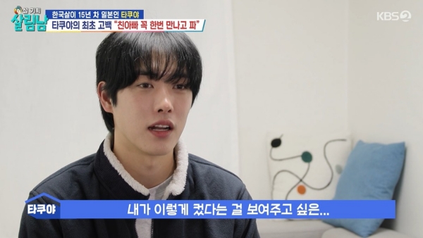 사진=KBS2살림하는남자들캡처[스포츠투데이송오정기자]일본출신방송인타쿠야가어린시절헤어진친부와다시만나성장한자신의모습을보여주고싶다고밝혔다.21일방송된KBS2'살림하는남자들'(이하'살림남')에초절약생활중인타쿠야의집을방문한어머니의모습이그려졌다.지난방송에서부모님의이혼사실을고백했던타쿠야.둘째동생과술자리서"친아빠기억나?난얼굴도잊어버렸거든.만나고싶지않아?"라며친아빠에대해언급하기도했다.이날방송에서도재차언급된친아빠의이야기에,타쿠야와어머니사이분위기는급격히숙연해졌다.무거운분위기속,어렵사리입을연타쿠야는갑작스러운이별로헤어진친부에대한궁금증을드러냈다.어머니는인터뷰서그런타쿠야의이야기에"놀라기도했고조금복잡한기분이었다"라고심경을털어놓았다.침묵하던어머니는"옛날에네가아빠가어디있냐고물었을때,'아빠가교통사고로사망했다'라고말하지않았냐"면서"뭐랄까.타쿠야가어릴때그렇게말한건엄마가한거짓말이었다"라고고백했다.계속해아빠를찾은타쿠야를위해거짓말을할수밖에없었던것.타쿠야는어린시절엔그거짓말을믿었으나친척어른의말을듣고아버지가살아있을수있단것을직감하고있었다.어머니의고백으로타쿠야는친부가1956년생으로올해71세란사실을난생처음으로알게됐다.이어타쿠야는친부를만나고싶단마음을조심스럽게드러냈다.그는인터뷰에서"딱히만나서할말은없다.내가이렇게컸다는걸보여주고싶은마음"이라고말했다.친부를찾을계획이있냐는제작진의질문에는"단서가없어서아직출발선에도서지못했다"라고답했다.[스포츠투데이송오정기자[email protected]]Copyright©스포츠투데이.무단전재및재배포금지.