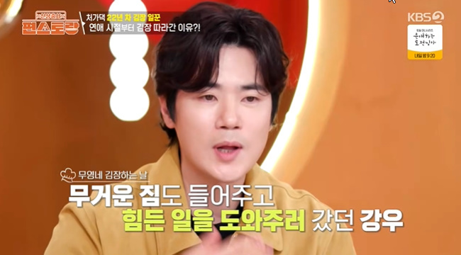 사진=KBS2TV‘신상출시편스토랑’캡처사진=KBS2TV‘신상출시편스토랑’캡처사진=KBS2TV‘신상출시편스토랑’캡처[뉴스엔이하나기자]김강우가22년동안처가김장에참여한사연을공개했다.2월20일방송된KBS2TV‘신상출시편스토랑’에는김강우가장모의고향에서처가식구들과김장하는모습을공개했다.김강우는“할머니댁인데할머니는돌아가셨고,장모님식구들이다저쪽에모여사신다.매년겨울저기를가서김장한다”라고충청남도덕산에매년김장을하러간다고말했다.친척들과반갑게인사를나눈김강우모습뒤로엄청난양의배추와김장재료가포착됐다.붐은“김치공장아닌가”라고놀랐고,김강우는올해는김치200포기를담갔다고전하며“가족들다모여서몇백포기식김장하는게저는되게재밌더라”고말했다.언제부터김장에참여했냐는질문에김강우는“제가결혼한지16년차다.연애를8년했으니까24년이다.사귄지2년째에쫓아다니기시작했으니까22년됐다”라고말해출연자들을놀라게했다.남자친구때부터처가에김장하러갔다는이야기에붐은“보통은결혼하고가지않나.연애할때부터간건가”라고물었다.김강우는“데이트도할겸남자니까힘도써주고짐도실어올겸갔다.무거우니까도와줘야겠다는단순한마음으로갔다”라고답했다.붐은“저희는두가지로좁혀진다.진짜로점수를따는것아니면처가에재산이많은거다.쉽지않은일이다”라고의심했다.김용빈도“한번은할수있는데22년동안계속하신것아닌가”라고거들자,김강우는“저는김장날가니까재밌더라”고말했다.뉴스엔이하나bliss21@기사제보및보도자료[email protected]ⓒ뉴스엔.무단전재&재배포금지Copyright©뉴스엔.무단전재및재배포금지.