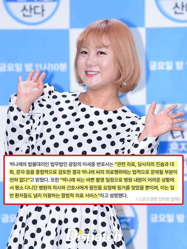 [Dispatch=김소정·유하늘기자]박나래의법률대리인이입장을밝혔습니다.①관련자료,당사자의진술과대화,문자등을종합적으로검토한결과…먼저,어떤(관련)자료를검토했는지궁금합니다.이사진은검토했을까요?이대화도요?박나래가(주사)언니네집으로간다는내용입니다.'디스패치'가종합적으로검토(취재)한결과,합법은보이지않습니다.그럼에도박나래는,그의법률대리인은다음의말을이어갔습니다.②박나래씨의의료행위에는법적으로문제될부분이전혀없습니다.의료법을찾아봤습니다.제33조:의료기관이아닌곳에서돈받고시술하는행위는무허가의료기관운영에해당한다.의료기관인가요?일산의한오피스텔일뿐입니다.혹시,원격의료라주장하는걸까요?제34조:원격의료를행하거나받으려는자는보건복지부가정하는시설과장비를갖추어야한다.이것은,보건복지부가정하는(원격)의료장비가아닙니다.(원거리)캐리어입니다.③박나래씨는바쁜촬영일정으로병원내원이어려운상황에서맞습니다.박나래는정말바쁩니다.그런데말입니다.(박나래)집주변에꽤많은병원들이있습니다.반면,집에서일산까지의거리는28km.그거리를가는시간이면,링거를맞고도남습니다.박나래는더강한약이필요했던걸까요?그도그럴게,주사이모는아낌없이투여한것으로보입니다.도대체어디서이많은약들을구한걸까요?'디스패치'는대리처방의증거(↓)를확보했습니다."지금많이준비하려고처방전모으고있어"박나래의해명과달리,주사이모는의사가아닙니다.그저,부지런히약을모으는이모?더욱심각한것은요?이취침약의정체입니다.OOOO캡슐식약처분류:정신신경용제박나래의취침약은,항우울제입니다.반드시의사의처방이있어야합니다.또한,다음환자에게는투여해선안됩니다.->알코올또는수면제중독환자그럼에도박나래는,계속(거짓)주장만이어갔습니다.④평소다니던병원의의사와간호사에게왕진을요청해링거를맞았을뿐이며,주사이모의이름은이OO입니다.(인스타그램프로필에는'내몽고의과대학특진교수'라고적혀있지만...)그이모는의사가아닙니다.이OO씨가운영하는사업체의법인등기입니다.화장품제조업,의료관광중개,인터넷쇼핑,엔터테인먼트...그런데왕진을요청했다고요?혹시,이왕진을말하는걸까요?이사진은카니발뒷좌석입니다.(차량)커튼사이로링거줄이보입니다.해외촬영에서돌아온날(2023년11월)박나래는주사이모를공항에불렀습니다.공항에서MBC로이동하는내내,링거를맞았습니다.이장면도,법률위반입니다.폐기물관리법제13조와18조를펼쳐보겠습니다.의료폐기물은의료기관또는시술자가반드시전문용기에모아전문업체에위탁처리해야합니다.의료폐기물을일반쓰레기로버리면,2년이하징역또는2,000만원이하의벌금에처합니다.⑤이는일반환자들도널리이용하는합법적의료서비스입니다.다들아래서비스이용하시나요?->배달의주사이모->문고리서비스->오늘의배달완료박나래는주사이모를해외촬영장까지데려갔습니다.'나혼자산다'대만촬영당시(2023년11월5일)대화입니다."A씨,주사언니모셔와유.저죽어가유.술도안깨고!"해외동행서비스도널리이용되나요?그리고,'나혼산'은이모의정체를알았을까요?추가취재할예정입니다.마지막으로,박나래법률대리인의해명을다시읽어보겠습니다."①관련자료,당사자의진술과대화,문자등을종합적으로검토한결과②박나래씨의의료행위에는법적으로문제될부분이전혀없습니다.③박나래씨는바쁜촬영일정으로병원내원이어려운상황에서④평소다니던병원의의사와간호사에게왕진을요청해링거를맞았을뿐이며,⑤이는일반환자들도널리이용하는합법적의료서비스입니다.”(광장)'디스패치'는박나래측이주장한①②③④⑤를'종합적'으로반박했습니다.박나래의의료행위는명백한불법입니다.그어떤행위에서도합법을찾아볼수없습니다.동시에,일산에사는,오피스텔에서링거를놓는,처방전을모으는,의약품배달하는,심지어해외로출장가는,현금으로입금받는주사이모에대한수사가필요해보입니다.Copyright©디스패치.무단전재및재배포금지.