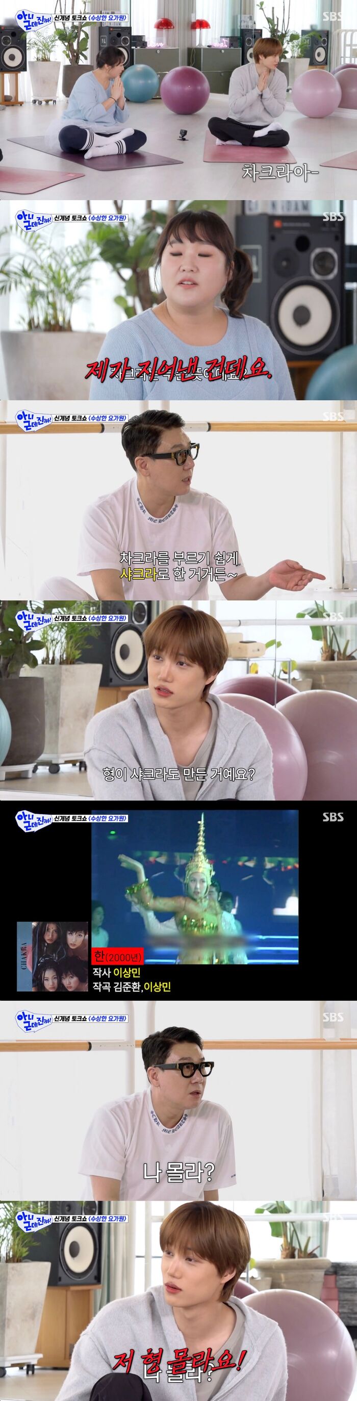 [SBS연예뉴스|김효정에디터]카이가프로듀서이상민에대한의문을드러냈다.23일방송된SBS'아니근데진짜'에서는탁재훈,이상민,카이가요가원을찾았다.이날세사람은광고와다른요가선생님의비주얼에깜짝놀랐다.특히탁재훈은"우리가생각했던요가선생님비주얼이아닌데"라고지적했고,카이는"그건머릿속으로만생각해야"라며큰형을타박했다.하지만요가선생님은아랑곳하지않고레슨을이어갔다.그는"왼쪽사람과인사합니다,차크라"라며카이에게만인사를해웃음을자아냈다.그리고이때이상민은"차크라가무슨뜻이냐?"라고물었다.이에요가선생님은"제가지어낸거다"라고뻔뻔하게말했다.그러자이상민은"인간의중심이되는7개의기운그걸차크라라고한다"라며"차크라를내가부르기쉽게샤크라로한거거든"이라고걸그룹샤크라를언급했다.이에카이는"진짜요?형이샤크라도만든거예요?진짜로요?"라고물었다.이상민은"너나몰라?"라며물었고,카이는"저형몰라요.진짜형이만든거예요?"라며세대차이를극명하게보여줘눈길을끌었다.Copyright©CopyrightⓒSBS.Allrightsreserved.무단전재,재배포및AI학습이용금지