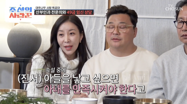 [OSEN=강서정기자]‘조선의사랑꾼’원진서가화끈한질문에윤정수가당황했다.지난23일방송된TVCHOSUN‘조선의사랑꾼’에서는심현섭,윤정수,배기성부부가결성한'대추나무사랑특공대'의여행을하는모습이공개됐다.숙소에도착해이들부부는산부인과전문의와화상통화를하며궁금한점을물어봤다.원진서는“속설줄에아들을낳고싶으면아내를만족시켜야한다이런얘기가있던데관계가있는얘기인가요?”라고질문했다.이에윤정수는“죄송한데잠시만요.부족했니?”라고했고원진서는“아니다.난항상만족했다”라고답했다.의사는“아내를만족시켜야임신이더잘된다.아들딸상관없이임신확률이올라간다.자궁이수축해서정자가더잘이동하고호르몬도더많이나와서여성의만족도가임신자체에영향은준다.심현섭은“이런얘기처음들었다”고했고배기성은“이젠만족까지시켜야하냐.이어서의사는“아내를만족시키는게너무중요하다”고했고윤정수는흥분하며“알겠어요.알겠습니다”라고했다.이에원진서는“화내지마.난만족한다니까”라며윤정수를진정시켰다./[email protected][사진]방송캡처Copyright©OSEN.무단전재및재배포금지.