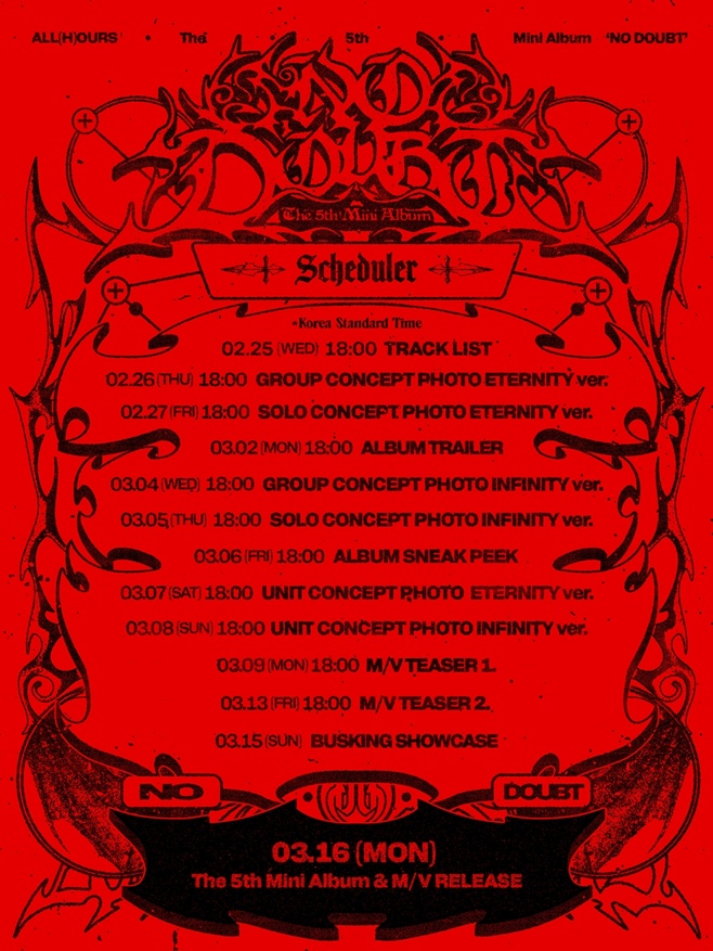 티브이데일리포토[티브이데일리김지하기자]그룹올아워즈(ALL(H)OURS)가글로벌팬심을사로잡을준비를마쳤다.24일소속사이든엔터테인먼트는"올아워즈(건호,유민,제이든,민제,마사미,현빈,온)가오는3월16일다섯번째미니앨범'노다웃(NODOUBT)'을발매한다"라고밝혔다.이와함께올아워즈는공식사회관계망서비스(SNS)를통해스케줄러이미지를공개했다.공개된이미지에따르면올아워즈는오는25일트랙리스트공개를시작으로본격적인컴백예열에돌입한다.26일과27일,3월4일과5일,3월7일과8일세차례에걸쳐콘셉트포토를공개하며팬들을설레게할예정이다.이어앨범트레일러와두가지버전의뮤직비디오티저를오픈하며팬들의기대감을고조시킬전망이다.특히앨범발매전날인15일일요일에는좀더많은팬들을직접만나기위해이전컴백때와는달리스페셜한버스킹쇼케이스를개최하고팬들을만날것을예고하며기대감을한껏끌어올리고있다.또한올아워즈는컴백소식에앞서지난23일SNS에'악마와의계약'라이브를예고해모두를술렁이게했다.이어같은날저녁11시공식유튜브채널을통해라이브가진행됐다.이날올아워즈는K팝산업의불합리함과선택받지못한괴로움등에대해이야기했고,멤버들이부조리함에환멸을느껴악마와의계약을진행하는모습으로글로벌팬들의궁금증을자극했다.'노다웃'는올아워즈가지난1월발표한팬송'나의봄,나의빛,나의숨'이후약2개월만에공개하는신보다.그동안자신들만의정체성을중점으로다채로운매력을선보이며사랑받은올아워즈는이번에도강렬한음악과비주얼,메시지를담은'노다웃'으로독보적인존재감을증명할계획이다.올아워즈는데뷔와동시에'신흥퍼포돌'로눈도장을찍었고,매앨범초동판매량자체최고기록을경신하며주목받았다.또앞서도쿄,오사카,홍콩,타이베이,유럽등지에서첫번째팬콘서트를성공적으로마무리한올아워즈는현재북미투어를통해7개의도시를돌며글로벌팬들과만나고있고,동시에컴백준비에박차를가하고있다.한편올아워즈의다섯번째미니앨범'노다웃'은오는3월16일오후6시각종온라인음원사이트를통해발매된다.[티브이데일리김지하기자[email protected]/사진=이든엔터테인먼트][Copyrightⓒ*세계속에新한류를*연예전문온라인미디어티브이데일리(www.tvdaily.co.kr)/무단전재및재배포금지]Copyright©티브이데일리.무단전재및재배포금지.