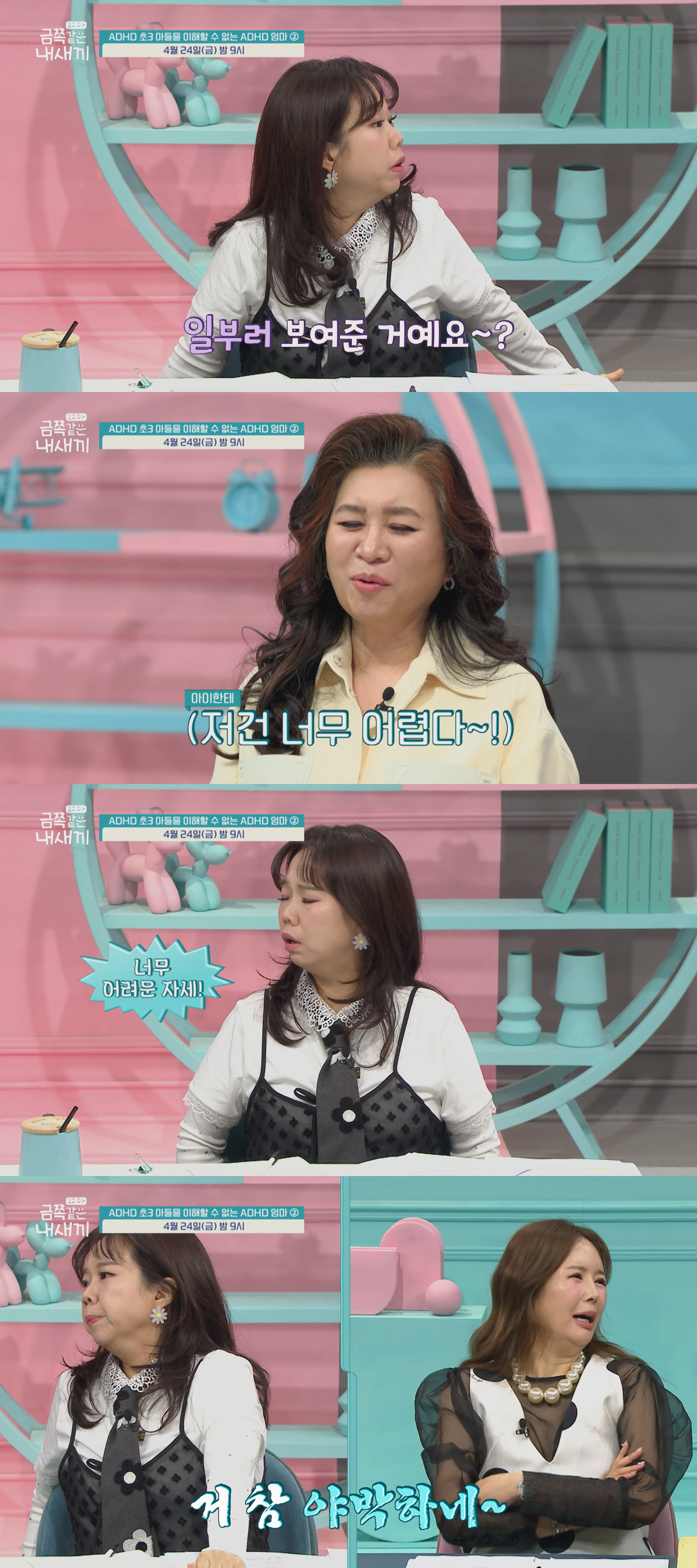 오은영박사가단호한금쪽이엄마의모습에일침을가한다.iMBC연예뉴스사진오늘(24일)방송되는‘요즘육아-금쪽같은내새끼’에서는‘ADHD초3아들을이해할수없는ADHD엄마’의두번째이야기가펼쳐진다.지난방송에서는엄마가금쪽이보다더심한ADHD라는사실이드러나큰충격을안겼다.선공개영상에서는거실한복판에서일촉즉발의솔루션현장이포착된다.주어진미션은종이컵테두리안에서10분동안요지부동버티기.금쪽이는충동을억누르며필사적으로버텨보지만,예상치못한재채기한방에몸이흔들리는위기를맞는다.그순간,엄마는일말의망설임없이냉정하게실패를선언한다.이에패널들은원성을쏟아낸다.입장을바꿔직접시범에나선엄마.생각보다힘든자세에힘들어하자,곁에서지켜보던금쪽이가"엄마라면할수있을것같아요"라며넌지시응원의말을건네뭉클함을안긴다.엄마의성공에이어이번에는금쪽이가두번째도전에나선다.잘버티는가싶더니돌연참아왔던눈물을쏟아내기시작한다.하지만엄마는금쪽이의눈물에도흔들림없이"훈련이야"라는말만반복하며냉정한태도를유지한다.이에오은영박사는“솔루션도좋지만,지금아이에게는격려의말이필요하다”라며엄마의단호함에따끔한일침을가한다.iMBC연예김혜영|사진출처채널ACopyright©MBC연예.무단전재및재배포,AI학습금지.