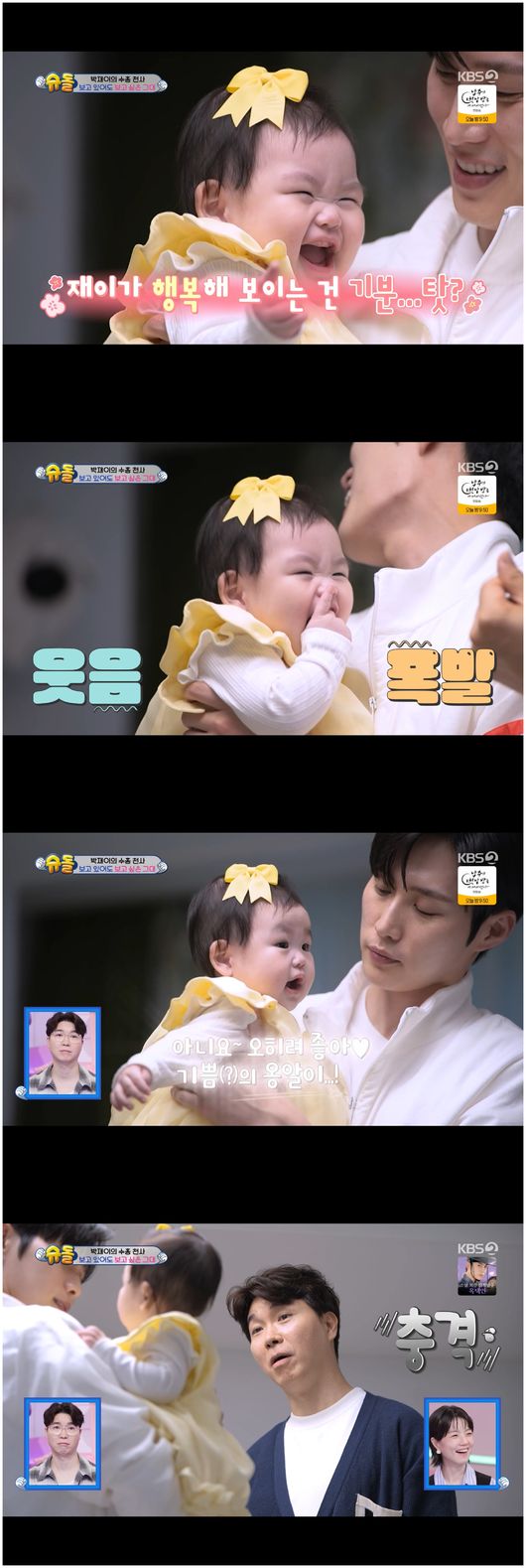 [OSEN=오세진기자]‘슈퍼맨이돌아왔다’박수홍딸재이가가장먼저마음의문을연상대는은우도정우도아닌김준호였다.11일방영한KBS2TV예능‘슈퍼맨이돌아왔다’(이하‘슈돌’)에서는핑크하우스로이사를한박수홍집으로김준호,은우,정우삼부자가첫집들이손님으로등장했다.김준호는아들둘아빠로서,여자아이인재이를보며신비롭다는듯눈을빛냈다.김준호는“재이실제로보니까영상보다피부도훨씬더하얗고눈도더컸다”라며감탄했다.박수홍은“내딸예뻤냐”라며우쭐해보였다.김준호는“정말너무예뻤다”라며“재이가실물파다.실물로보면진짜너무예뻐”라면서칭찬했다.박수홍은“재이가은우,정우중에누굴더좋아할지정말궁금했다.은우는33개월인데아빠자려니까불꺼줄까,이랬고,정우는또우리재이랑잘어울릴거같더라”라며사윗감들을흐뭇하게바라보았다.정작재이는김준호를보며팔을벌렸다.박수홍은충격에빠졌다.김준호는“재이가내심나에게안안기길바란거같더라”라고말했다.박수홍은“아빠말고는다른사람에게팔을뻗는경우가별로없는데”라고말하다가김준호에게안긴채아빠에게안가겠다고고개를돌린채김준호를보며너무나행복하게웃음을터뜨리는재이를보면서크나큰충격에빠졌다./[email protected][사진]KBS2TV예능‘슈퍼맨이돌아왔다’Copyright©OSEN.무단전재및재배포금지.