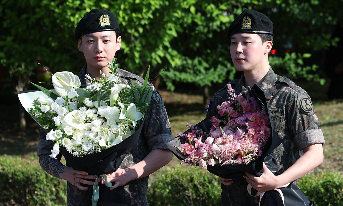 슈가21일소집해제…완전체눈앞그룹방탄소년단(BTS)의지민과정국이11일1년6개월의군복무를마치고전역했다.이들은이날오전8시쯤경기연천군공설운동장에모인팬덤‘아미’앞에서전역소감을남겼다.지민은“신종코로나바이러스감염증(코로나19)부터군복무기간까지꽤긴시간이었는데기다려주셔서감사하다”며“전역을했기때문에저희가그려나가던그림을그려나가겠다.잘준비해서보여드리겠다”고말했다.육군현역복무를마치고만기전역한그룹방탄소년단(BTS)의지민(오른쪽)과정국이11일경기연천군연천공설운동장에서꽃다발을안은채전역인사를하고있다.연천=연합뉴스그는이어“군대를와보니쉽지않은곳이었던것같다”며“고생하는분들이많고,길에서군인을보게된다면따뜻한말씀한마디라도해주면감사하겠다”고전했다.정국은“카메라앞이오랜만이라민망한데무슨말을해야할지모르겠다”며“남은후임들과조금일찍전역한동기들고생많았고,간부님들저희랑같이생활하신다고고생많으셨다.장챙겨주셔서감사했다고말씀드리고싶다”고말했다.전역소감을마친이들은팬들을향해손을흔들고인사를하면서현장을떠났다.이날행사장일대는이른아침부터수많은팬과취재진이지민과정국을기다렸다.‘이제다시하나된날,언제나지민과함께’,‘보고싶었어정국아,전역축하해’등이적힌대형애드벌룬도상공에떠올랐다.전날RM과뷔가전역한데이어이날지민과정국도제대하면서BTS멤버7명중6명이병역의무를마쳤다.공익근무요원으로대체복무해온슈가는이달21일소집해제예정이다.박세준기자[email protected]©세계일보.무단전재및재배포금지.