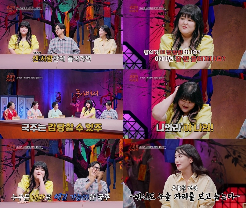 SBSLife‘신빨토크쇼-귀묘한이야기’MC이국주가악귀를이겨낼기운이있다고해웃음을자아냈다.최근진행된SBSLife‘신빨토크쇼-귀묘한이야기’(이하귀묘한이야기)11회촬영에서악귀에대한이야기를나누던중귀묘객(客)전민기는“쓸데없는질문인데악귀가이국주처럼센사람한테빙의가되면더잘발현되냐,아니면빙의가잘안되냐”라고질문을던졌다.천상작두장군조만신은“(이국주가)감당할수있다.(악귀를)이겨낸다”고답했다.이를듣고있던이국주는자신의뒷목을붙잡고“(귀신아)나와라!나와!알았으니까나와.이야기들어줄테니까나와라.뭐가그렇게힘들었니?이야기를해봐라”라고상황극을펼쳐스튜디오를폭소케했다.정미녀는“귀신도누울자리를보고발을뻗나보다”라고덧붙여무속인들을웃게했다.신빨토크쇼-귀묘한이야기’는‘부부’라는주제로펼쳐졌다.천신애기는전민기-정미녀부부에대해“두분의전생을봤는데전민기는스님모습이보였고,정미녀는마을주막에주인이었다.스님이마을에내려오면주모가많이베풀었다.인연이없으면만날수없다”라고전했다.이외에천신애기이여슬,산신장군김옥순,명화당함윤재,일월정사정일경,천상작두장군조만신,천명도사손노아등무속인들은각각자신이경험한전생부터빙의까지기묘하고오싹한이야기들을전해이목을집중시켰다.이국주,전민기-정미녀부부등이출연하는‘귀묘한이야기’는10일밤10시10분SBSLife에서확인할수있다.손봉석기자[email protected]©스포츠경향.무단전재및재배포금지.