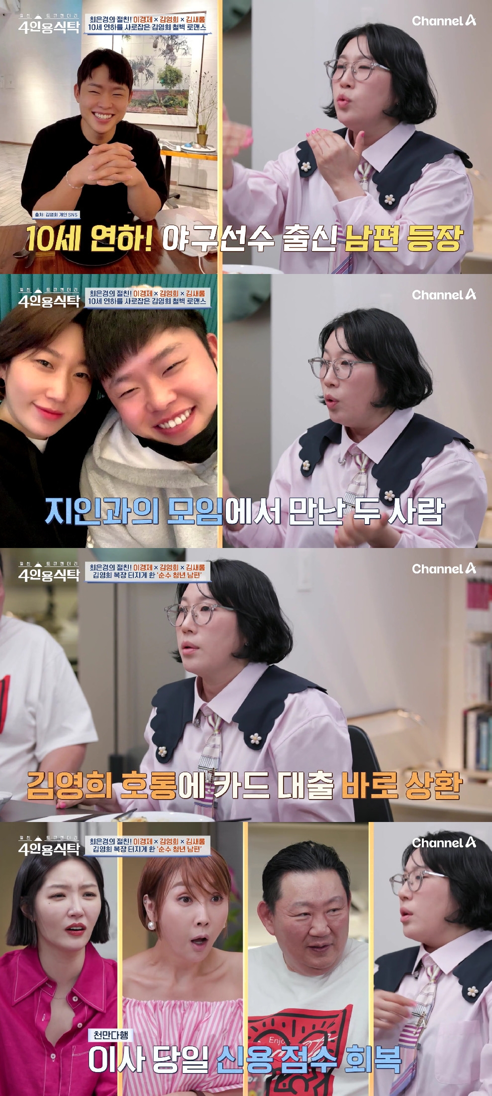 [스타뉴스|김나연기자]사진=채널A4인용식탁코미디언김영희가10세연하의남편과첫만남에대해밝혔다.9일오후방송된채널A'절친토큐멘터리-4인용식탁'에서는방송인최은경편이방송된가운데,최은경은한의사이경제,개그우먼김영희,방송인김새롬을자신의집으로초대했다.김영희는10세연하의남편과만남에대해"사고같은거다.무려11년만에사랑이찾아왔는데연하에야구선수출신이었다.지인과의모임에서만났는데처음엔안믿었다.나한테'왜이렇게예뻐요?'라고하는데11년동안감정이메마르니까'놀려요?'라고답했다"고말했다.이어"모임후지인이단감을바리바리싸줬는데본인이들어준다고하더라.그때'내거야'라고하고,엘리베이터문이닫힐때'그런건좀못하셔도되는데'라고하더라.그때남편이고백했고,속전속결로결혼하게됐다"고밝혔다.그러면서"이남자와결혼하겠다고생각한건연애4개월때쯤이었다.너무착하고밝고,세상물정은하나도모른다.나한테잘해주려고대출받아서선물사주고그랬다.선물은항상12개월할부였다"고했다.또한김영희는"출산후조리원에있을때불안했다.조리원퇴소일주일후이사하게됐는데남편명의로전세자금대출을받아야했다.근데부동산에서전화와서'남편분이카드대출받아서신용등급이떨어졌다'고하더라.근데출산기념선물을사주고싶어서받은거다.제가화내니까카드대출을바로상환하고,이사당일신용점수가회복됐다"고전했다.김나연기자[email protected]©스타뉴스&starnewskorea.com,무단전재및재배포금지