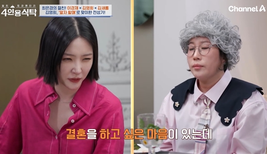 (엑스포츠뉴스문채영기자)김영희가김새롬의재혼을말렸다.9일방송된채널A'절친토큐멘터리–4인용식탁'에는김새롬과김영희가출연했다.김새롬이"고민이있다.저도결혼을하고싶은마음이있는데,나이를먹을수록이상형이점점는다.뭘포기해야하냐"며'말자할매'로분한김영희에게질문했다.김영희는"갔다오셨다.그런부분에있어서는진짜다포기해야한다.다내려놓아라"라고답해웃음을자아냈다.이어그는"결혼을또하지는마셔라.(결혼이)별로다.연애를하셔라.다내려놓으면연애를할수있다.결혼상대를찾다보니까계속(이상형이)올라가는거다"라고밝혔다.이경제는"날카롭다"라고말했다.답변을들은김새롬도"법륜스님같다.진짜너무시원하다.깜짝놀랐다"라며감탄했다.최은경은김영희에게"(말자할매를)어떻게(시작)한거냐"라고물었다.김영희는"방송을오래못하게됐을때,개그우먼으로서직업이흔들렸다.나는웃기고싶어서코미디연극도하고,스탠드업코미디도했다.연극이거의애드리브공연이다"며,"역할이관객고민들어주고,즉문즉답하는거다.7년을했다.방송으로할줄은몰랐다.'개그콘서트'생기면서하게됐다"라고답했다.사진=채널A방송화면문채영기자[email protected]©엑스포츠뉴스.무단전재및재배포금지.