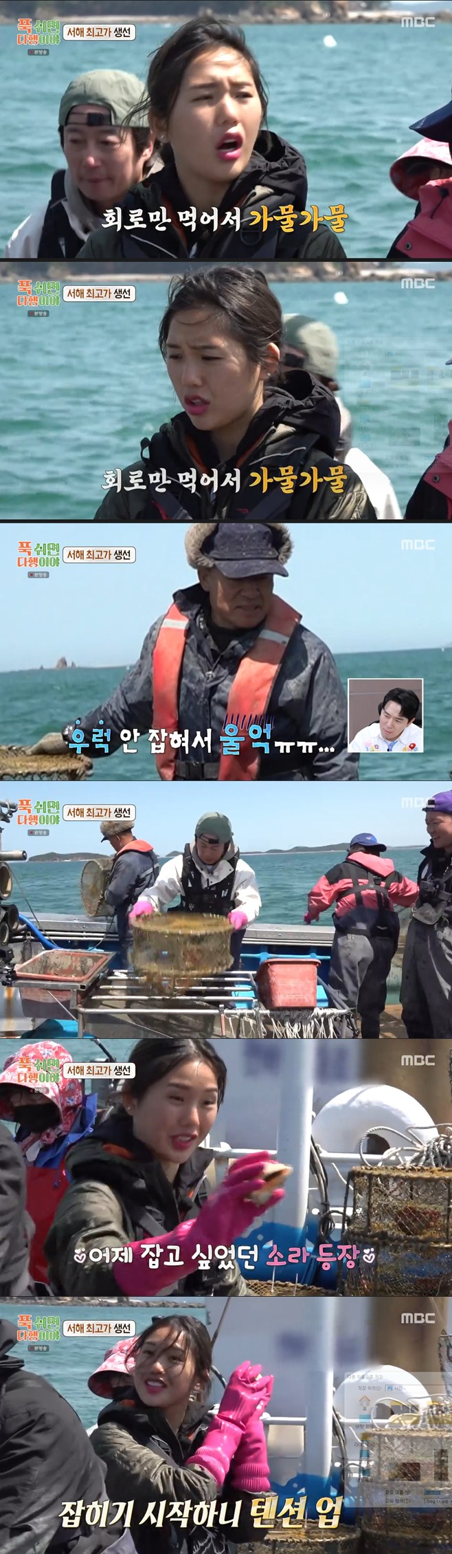 티브이데일리포토[티브이데일리이기은기자]‘푹쉬면다행이야’미미,‘소라춤’을선보였다.9일밤방송된MBC예능프로그램‘푹쉬면다행이야’에서는이수근,김대호,오마이걸미미,이은지등의서해사냥이공개됐다.이날패널과게스트들은직접배에타서우럭잡기에도전했다.통발에는불가사리등만걸렸다.수어시간이지나도고기는잡히지않았고,이들은서로눈치를봤다.선장님도연예인들의눈치를볼정도였다.불가사리만잔뜩잡히는상태였다.배에무언가가잡혀야식재료를얻어가는게가능했다.이가운데소라,삐뚤이등먹거리가조금씩잡혔고,이수근은군말없이통발을잘털어내며선장님의칭찬을듣기도했다.미미는슬슬먹거리가잡히자소라를들고‘소라춤’을추며시선을강탈했다.드디어잡힌첫물고기는우럭한마리였다.[티브이데일리이기은기자[email protected]][Copyrightⓒ*세계속에新한류를*연예전문온라인미디어티브이데일리(www.tvdaily.co.kr)/무단전재및재배포금지]Copyright©티브이데일리.무단전재및재배포금지.