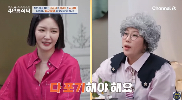 [스포츠조선닷컴정안지기자]김영희가결혼하고싶다는'돌싱'김새롬에게명쾌한대답으로웃음을안겼다.채널A'절친토큐멘터리-4인용식탁'측은이날본방송에앞서"리얼100%즉석고민상담!명쾌,상쾌,통쾌한말자할매의답변"이라며선공개했다.이날최은경은한의사이경제,개그우먼김영희,방송인김새롬을자신의집으로초대해'건강식단한상'을대접했다.그때최은경은현재'말자할매'캐릭터로맹활약중인김영희에게"전국을다니면서너무바쁘다"며언급했다.김영희는KBS2'개그콘서트'에서'말자할매'캐릭터를통해시청자들의고민에대한명쾌한해답으로웃음과감동을주고있다.이에이날김영희는'말자할매'로깜짝변신해,이경제와김새롬의고민을해결했다.이경제는"살을빼기위해서안해본게없다.100일무탄무당다이어트도했다"면서"지속적이지못한다이어트가고민이다"며고민을밝혔다.이에김영희는"그건늙어서그렇다.노화다"며속시원한고민상담으로웃음을안겼다.또한김새롬은"결혼을하고싶은마음이있는데나이가들수록눈높이가높아지지않나.그중에뭘포기해야할까"라며솔직하게고민을털어놨다.그러자김영희는"한번갔다오셨지않냐.그런부분에있어서는다포기해야한다.단하나도없다.다내려놓아야한다"며명쾌한해답뒤,"결혼을또하진마셔라"라고했다.이를들은김새롬은"본인은결혼생활중이시지않냐"고하자,김영희는"별로다"고말해폭소를자아냈다.이어김영희는"다내려놓으면연애를할수있다.근데결혼상대를찾다보니까눈이높아지는거다.조건생각하지말고연애하라"고해웃음을안겼다[email protected]©스포츠조선.무단전재및재배포금지.
