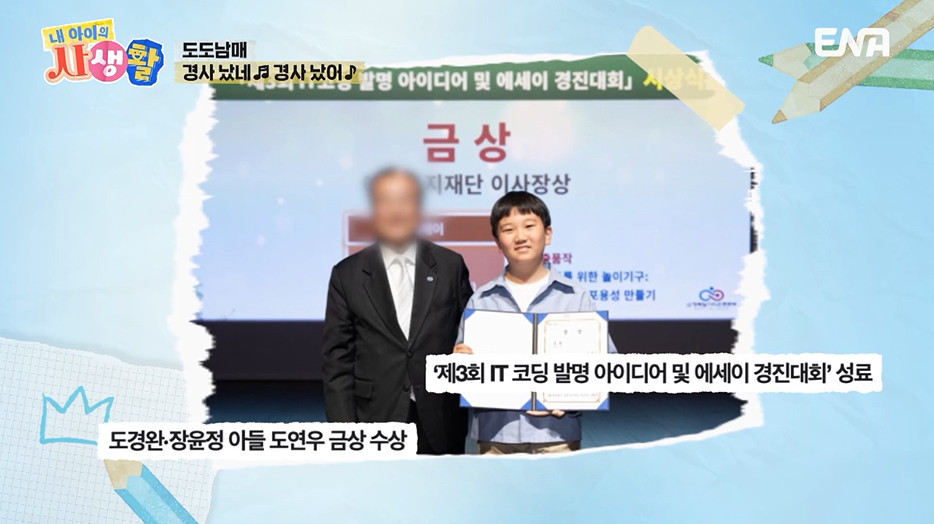 ENA‘내아이의사생활’캡처ENA‘내아이의사생활’캡처[뉴스엔장예솔기자]장윤정,도경완부부아들연우가코딩대회에서입상했다.6월8일방송된ENA'내아이의사생활'에서는난생처음육아에도전하는도도남매연우,하영의모습이공개됐다.이날오프닝에서이현이는"축하할일이있더라.연우가코딩발명아이디어및에세이경진대회에서무려금상을탔다.기사가엄청났다"며장윤정,도경완부부에게축하를보냈다.장윤정은"거기갔는데다른연예인부모님도몇분계셨다.연우가계속앞에나가니까괜히부끄럽더라"며겸손함을드러냈다."연우가잘하기때문"이라는이현이의칭찬에장윤정은고개를끄덕이며"우리연우기특하다"고아들을향한애정을드러냈다.한편장윤정과도경완은지난2013년결혼해슬하에아들연우,딸하영을두고있다.뉴스엔장예솔imyesol@기사제보및보도자료[email protected]ⓒ뉴스엔.무단전재&재배포금지Copyright©뉴스엔.무단전재및재배포금지.