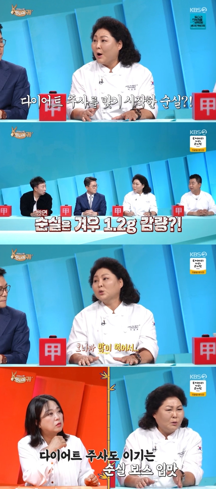 ‘사당귀’.사진lKBS이순실이다이어트주사를맞은효과가없다고밝혔다.8일오후방송된KBS2예능프로그램‘사장님귀는당나귀귀’(이하‘사당귀’)에서패널은다이어트에관해대화했다.이날방송에서마라톤으로살을빼고있다는정호영셰프의말을들은이순실은“저도요즘애고비인지,아고비인지다이어트주사맞아요.같이맞기시작한사람들은다3kg씩빠져요.그런데나는1.2g만빠지는거예요.알고보니계속먹어서...”라며주사도이기지못한식욕을자랑했다.이에성동구청장이“저는살이빠져본적이없다”라고하자이순실은“성격이고약하면살이안찐대요”라고한방먹였다.‘사당귀’는매주일요일오후4시45분KBS2에서만날수있다.[서예지스타투데이객원기자]Copyright©스타투데이.무단전재,재배포및AI학습이용금지