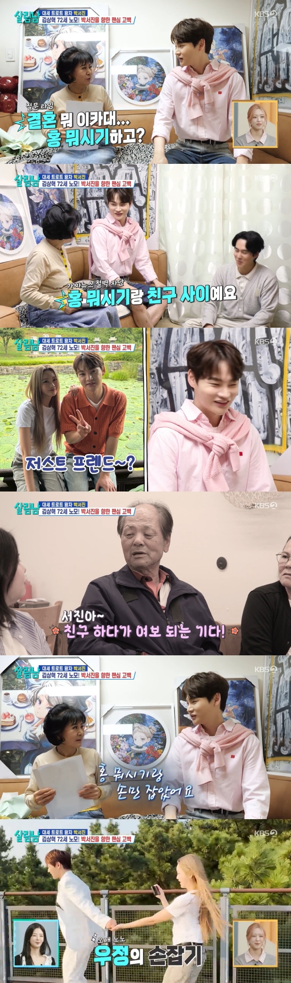 사진=KBS2[스포츠투데이김태형기자]가수박서진이홍지윤과의결혼설에입장을밝혔다.7일방송된KBS2'살림하는남자들시즌2'에는박서진이꽃다발을들고김상혁집을찾은모습이그려졌다.이날박서진은꽃다발을김상혁의어머니에게선물하며훈훈함을안겼다.김상혁은"(박서진과)친해지고싶고저희어머니도많이좋아하신다.그래서초대하게됐다"고설명했다.김상혁의어머니는"내옆에앉아라"라며박서진옆에붙어앉았다.함께사진도찍는등팬심을한껏드러냈다.그는"하루종일박서진씨노래를틀어놓는다"며"'춘몽'을들으면젊을때생각이난다.옛날에내가연예인하려고학원을다녔다.그때나보고예쁘다고하니까착각하고"라고밝혔다.박서진은어머니를위해즉석라이브를선보이고사인까지해줬다.어머니가"서진왕자님"이라고애정을드러내자,김상혁은"나는왕자님소리를태어나서한번도못들어봤다"며질투했다.김상혁어머니는"내가왕자소리를잘안한다.손자보고도안한다.얼마나좋으면왕자님이라하겠냐"고말했다.그러면서"홍뭐시기하고결혼하는거냐"며홍지윤과의결혼설을언급했다.이에박서진은"저는홍뭐시기하고(홍지윤과)친구사이"라며"절대결혼할수없다"고선을그었다.김상혁은"서진이모태솔로라더라"라고쐐기를박았고,박서진은"손도못잡아봤다"면서도"아잡아봤구나.한번"이라며웃었다.이어박서진의아버지가"오빠동생이여보당신이되더라"라고말한장면이자료화면으로등장해웃음을안겼다.[스포츠투데이김태형기자[email protected]]Copyright©스포츠투데이.무단전재및재배포금지.