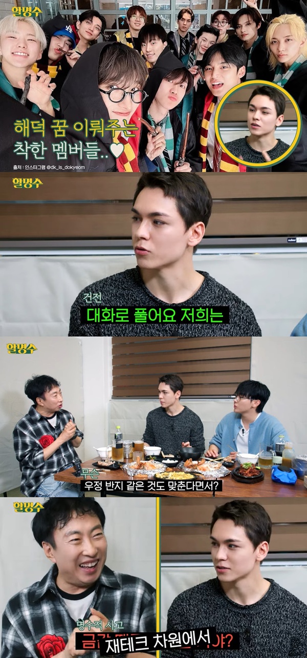 세븐틴박명수/사진=유튜브채널할명수캡처[스포츠투데이임시령기자]'할명수'버논과승관이세븐틴팀반지를언급했다.6일유튜브채널'할명수'에는'T심은데T난아들버논이와아들친구F승관이의세븐틴(SEVENTEEN)10년치취중고백'라는제목의영상이공개됐다.이날박명수는두사람에게"세븐틴이총13명인데,회식외에는다모일일이없을것같다"고모임얘기를꺼냈다.버논이"원래정모를했었는데몇달못했다"고아쉬워하자승관은"주최자가장소를정해야한다"고말했다.버논은"영국갔을때도겸이식당을예약했는데,해리포터교복이랑지팡이를들고밥을먹었다"고떠올렸다.이를들은박명수가"결산받는날흥청망청논적없냐"고질문하자버논은승관을보며"네가좀흥청망청놀지않냐"고해웃음을안겼다.이후박명수는세븐틴13명의친밀함에대해물었다.감정대립이있을때어떻게하냐는질문을받자버논은"대화로푼다"고말했다.승관도"최근에도대화크게한번한적이있다.정규앨범은나오는데,완전체가아니니까불안감이있는상태에서예민함과조급함이있다.그런것을대화로잘풀고있다"고털어놨다.버논은"팀반지가있다.정규마다새로맞추는데,정규5집을발매하게돼서"라며"재테크차원에서"라고너스레를떨었다.[스포츠투데이임시령기자[email protected]]Copyright©스포츠투데이.무단전재및재배포금지.