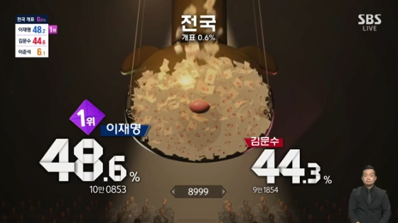 [스타뉴스|김정주기자]/사진=SBS개표방송'2025국민의선택'방송화면제21대대통령선거본투표가마무리된가운데,SBS가후보자들의치열한접전을'오징어게임'으로패러디해눈길을끌었다.3일방송된SBS개표방송'2025국민의선택'에서는이재명더불어민주당후보와김문수국민의힘후보의개표상황을넷플릭스시리즈'오징어게임'속참가자들을연상케하는컴퓨터그래픽(CG)으로패러디한모습이그려졌다.이날'대결2025:승부사들'이라는타이틀로진행된개표방송에서두후보는'오징어게임'속체육복을입은채다양한전통놀이와게임을통해개표상황을전했다.이재명후보는파란색체육복을입었고,김문수후보는빨간색을입어각당을상징했다.먼저SBS선거방송의마스코트'투표로'가술래가된'대선의꽃이피었습니다'는'무궁화꽃이피었습니다'를모티브로시작됐다.'투표로'의노래로시작된게임에서서울은이재명후보가1위를달렸고,경기는김문수후보가선두를달리고있는상황을알렸다./사진=SBS개표방송'2025국민의선택'방송화면다음으로이어진'말뚝박기'게임에서두후보는가위바위보를통해'투표로'의등에올라탔고,'땅따먹기게임'에서는각각파란돌과빨간돌을땅바닥에던지며승부수를던졌다.그런가하면실내운동장으로장소를옮긴'투표로'는'삐끼삐끼'챌린지에나서분위기를전환했다.두후보는'딱지치기'에나서각각빨간딱지와파란딱지를던지며승부를이어갔고,'줄다리기'를하며치열한접전을벌였다.또에어펌프를통해대형공을만든두후보는자신의앞에놓인파란공과빨간공을힘차게굴리며질주를이어갔다.두사람은'물총쏘기'게임을통해시원한격전을벌이는가하면마지막'전국최후의1인'을놓고벌인경쟁에서는허공에매달린투명한원형통에투표용지가떨어지며이재명후보가48.6%로앞서고있다는사실을공개했다.김정주기자[email protected]©스타뉴스&starnewskorea.com,무단전재및재배포금지