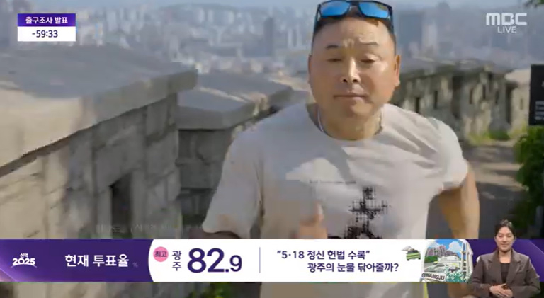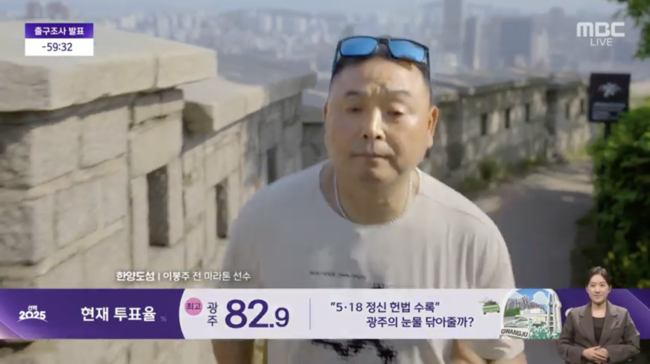 [OSEN=김채연기자]희귀병을투병했던마라토너이봉주가제21대대통령선거개표방송에등장했다.3일MBC‘선택2025’에서는제21대대통령선거개표방송을진행하면서출구조사결과발표1시간을앞두고전국투표율을공개했다.공개된영상에서는다양한마라토너들이전국각지를달리는모습을보이면서투표율을공개했고,가장마지막에등장한마라토너이봉주와함께전국투표율77.8%를발표했다.특히이봉주는반팔티셔츠에트레이닝바지를입고머리에선글라스를걸치고뛰는모습이드러냈다.앵커도“익숙한얼굴,국민마라토너이봉주씨다.희귀병인근육긴장이상증을앓았으나이젠회복의길에서새로운내일을향해달리고있다.함께달려온대한민국여정의끝,전국77.8%”라고설명했다.앞서이봉주는2020년원인불명의통증에시달리기시작하며‘근육긴장이상증’이라는희귀병판정을받았다.1년동안내로라하는병원,한의원을찾았으나원인을찾지못했고,이로인해허리가굽어바닥만보고걸어야하는상황이었다.그러나최근알려진근황에서이봉주는허리를곧게편상태로봉사활동을하기도하고,마라톤을뛰는등다시한번달리기시작해많은이들의응원을받았다.이번개표방송에서도이전과같이달리는모습이포착돼시선을끌었다.한편,이날오후8시기준전국투표율은79.4%이며,지상파3사공동출구조사결과이재명더불어민주당후보가51.7%,김문수국민의힘후보가39.3%,이준석개혁신당후보가7.7%를기록했다./[email protected][사진]방송캡처Copyright©OSEN.무단전재및재배포금지.