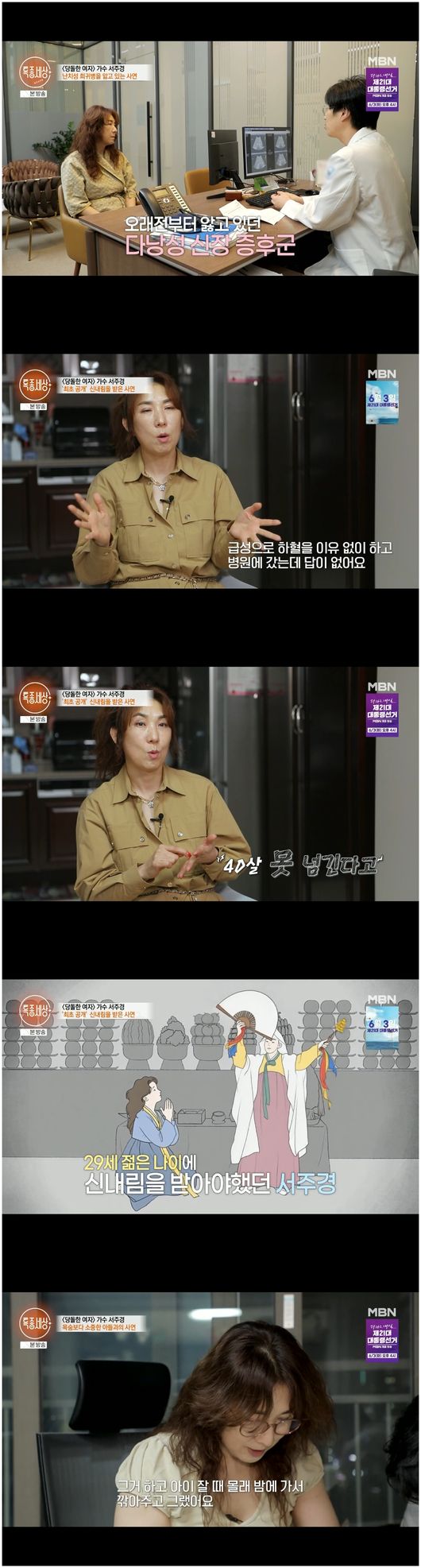 [OSEN=오세진기자]‘특종세상’가수서주경이신내림을받을수밖에없던이유를밝혔다.29일방영한MBN‘특종세상’에서는가수이자소속사대표그리고신내림을받은몸으로살고있는서주경이등장했다.서주경은사랑스러운아들을자랑했다.15살장선우군은또래의흔한사춘기가전혀없는,맑고착한아이였다.아들은어렵게얻은아이였다.서주경은“보통여자들이자궁근종을갖고있다고하는데,불과한3~4개월전에근종2개가2cm라고했다.그런데허리도못펴고골반도아팠다.초음파를하니까근종이10cm크기로커졌다.이게급성으로커졌다.그게자궁내막까지가서아이를못가질거라고하더라”라고말했다.그는“자궁이언제파열될지몰라서아이를가질수없었지만,아이를꼭낳고싶었고엄마가되고싶었다.그런데엄마가될수없다고해서우겼다”라면서“엄마가소원이었다”라고말했다.42살,늦은나이에얻은아들.그러나서주경은남편과헤어졌다.서주경은“그런걸졸혼이라고한다.이혼이든졸혼이든상관없다.한집에살지않을뿐5분거리에살고있고,소통하고있다.언제든아빠를만나러갈수있다”라며“저는우리의출생신고를위해서혼인신고를했고,결혼식이나결혼반지도없었다.그냥한번좋아하는사람이랑살고싶었다”라고말하며후련한표정을지었다.서주경의대표곡은'당돌한여자'였다.19살나이부터가장이된서주경은가수의길에올랐다.같은유전병을앓는서주경의언니는“그몸으로무대를올라가면정말힘든데,내려오면응급실을가야하는상황이되니까정말속상하다”라며그를안타까워했다.서주경은“우리집뿐아니라전체적으로가장이었다.그런데그게좋았다.가장으로서열심히하면돈이들어오고,그래서제가해줄수있는것에감사했다”라며전혀고되지않다는표정을지었다.그러나그는온몸에낭종이있었고,항상죽음을각오하고살고있었다.그렇기에서주경은아들장선우군을생각하며일찍세상을떠날까봐그를슬퍼했다.서주경은“콩팥뿐아니라담당,간,폐,갑상선,뇌너무많은곳에낭종들이있다는데그게몇개가될지알수가없더라.그래서항상생각을하고대비를해야한다.이세상에나혼자면대비를해야하는데,아기가있으니까”라며서글픈미소를지었다.그런그의인생에는또한가지고난이있었다.무수히많은꿈을꾸고몸이이유없이아팠던것.이에서주경은신내림을받게됐다.고작29살나이였다.서주경은“급성으로하혈하는데이유도없고,자꾸혼자중얼중얼거리고,사람들이저더러마흔을못넘긴다고했다”라면서“무서웠다.난노래를해야하는데,할일이태산인데.그래서큰어른이작두를탔다.소를잡고돼지도잡고빌었다”라고말했다.이어서주경은“무속인이되는걸원하지않았다.제가빌었다.노래하게해달라고,좋은일많이하겠다고,노래해서번돈은다돌려드리겠다고했다”라며“그래서기도해서곱게잘싸서사찰부처님밑에모셨다”라면서가수생활을이어갈수있는이유를밝혔다./[email protected][사진]MBN‘특종세상’Copyright©OSEN.무단전재및재배포금지.