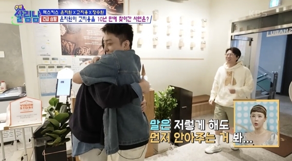 젝스키스멤버은지원과고지용의재회가안방극장을뭉클하게했다.24일방송된KBS2예능프로그램‘살림하는남자들’에서는은지원이건강이상설에휘말린고지용을찾아가는모습이그려졌다.2016년MBC‘무한도전’젝스키스완전체이후처음으로이뤄진만남이었다.이날은지원은어머니에게받은고지용의최근모습을보고“어,얘왜이렇게말랐지?”라며놀라움을감추지못했다.180cm의키에63kg까지체중이줄었다는고지용의근황에걱정이앞선은지원은“바로가봐야겠다”며발걸음을옮겼다.24일방송된KBS2예능프로그램‘살림하는남자들’에서는은지원이건강이상설에휘말린고지용을찾아가는모습이그려졌다.2016년MBC‘무한도전’젝스키스완전체이후처음으로이뤄진만남이었다.사진=‘살림남’캡처은지원은혼자가기쑥스럽다며장수원을불러함께고지용을찾아갔고,오랜만에마주한세사람은순간의어색함도잠시,이내장난기가득한웃음으로시간을되돌렸다.은지원은“궁상떨고있네”라고말하면서도고지용을꼭안아주며진심을전했다.고지용은“그때(건강악화시절)간수치가급격하게올라가서입원까지했었다”며당시의심각한상태를털어놨고,장수원은“그때는누가봐도문제있어보였어”라며고개를끄덕였다.이어진대화에서고지용은아들승재의근황도전했다.현재초등학교5학년이된승재는영재바이올린학교에다니며3년째실력을쌓고있다고밝혀감탄을자아냈다.결혼계획을묻는고지용에게은지원은“해야지.이러다진짜고독사하겠다.쓰러졌을때누군가119는불러줘야하지않겠냐”며현실적인농담을건넸다.또“차를샀었는데탈일이없어서못타다가,‘한번타볼까’했더니배터리방전됐더라”며‘집순이’다운면모를드러내웃음을자아냈다.[김승혜MK스포츠기자][ⓒMK스포츠,무단전재및재배포금지]Copyright©MK스포츠.무단전재및재배포금지.