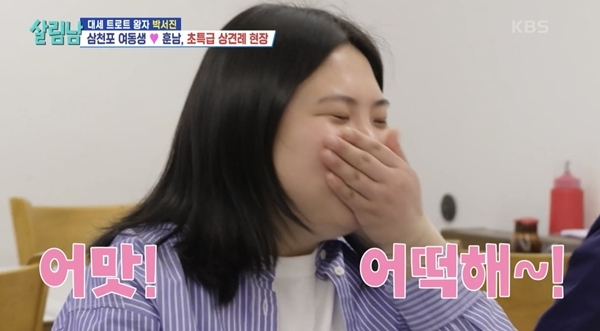 박서진의동생박효정이삼천포의훈남해남과뜻밖의핑크빛기류를형성하며시청자들의설렘을자극했다.24일방송된KBS2TV예능‘살림하는남자들’에서는박서진가족의삼천포일상이공개됐다.이날박서진과박효정은해녀체험을위해바닷가를찾았고,그곳에서훈훈한외모의해남과인연을맺게됐다.박효정은체험중해남과유독다정하게시간을보내며자연스러운케미를자랑했다.귀엽고소탈한모습에해남은은근한스킨십으로박효정을챙겼고,이를지켜보던박서진은웃음을참지못하고광대가치솟은채흐뭇한표정을지었다.박서진의동생박효정이삼천포의훈남해남과뜻밖의핑크빛기류를형성하며시청자들의설렘을자극했다.사진=‘살림남’캡처스튜디오에서도반응은폭발적이었다.“오빠한테저런적있어요?”,“이건챙김이아니라관심이다”,“효정이는금사빠가아니라급사빠”등폭풍리액션이쏟아졌다.이후온가족이식사자리에모인자리에서는분위기가더욱고조됐다.박효정은“그래서내가좋다고는하냐”며해남의반응을직접적으로묻는가하면,어머니도“남자마음이중요하다”며은근히분위기를부추겼다.해남역시“직장을관두고내려온뒤내직업을이해해주는사람이좋다”며진지한속마음을드러냈고,박서진은“우리동생은끈기가있다”며조심스레‘사랑몰이’까지감행했다.특히“머리카락도잘라서기부하고,바디프로필도찍은아이”라며자랑을이어가며웃음을자아냈다.한편KBS2TV‘살림하는남자들’은매주토요일방송되며,스타가족들의리얼살림과소소한일상이따뜻한웃음을전하고있다.[김승혜MK스포츠기자][ⓒMK스포츠,무단전재및재배포금지]Copyright©MK스포츠.무단전재및재배포금지.
