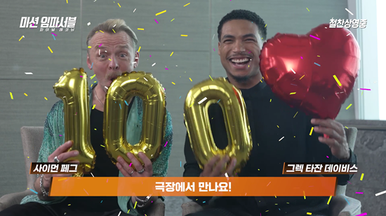 영화'미션임파서블8'출연한사이먼페그,그레그타잔데이비스의감사영상[롯데엔터테인먼트제공.재판매및DB금지](서울=연합뉴스)오보람기자=톰크루즈주연의할리우드영화'미션임파서블:파이널레코닝'(이하'미션임파서블8')이개봉닷새째인21일누적관객100만명을돌파했다고배급사롯데엔터테인먼트가밝혔다.올해최고흥행작인한국영화'야당'보다사흘빨리100만관객을달성했다.'미션임파서블8'에출연한배우사이먼페그와그레그타잔데이비스는한국팬들에게보내는영상에서"보내주신사랑에감사드린다.올5월단하나의선택은'미션임파서블8'이다.극장에서만나자"고말했다.크리스토퍼맥쿼리감독이연출한이작품은인류전체를위협하는절체절명의위기속에서임무를맡은에단헌트(톰크루즈분)의여정을그린액션물이다.개봉일인지난17일하루에만42만3천여명을동원했고이후에도일일박스오피스와예매율에서1위를유지하며흥행을이어가고있다[email protected]▶제보는카톡okjeboCopyright©연합뉴스.무단전재-재배포,AI학습및활용금지