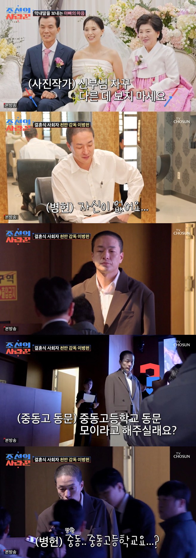 ▲출처|TVCHOSUN'조선의사랑꾼'캡처[스포티비뉴스최신애기자]배우이병헌이아닌이병헌감독이심현섭결혼식의사회를멋지게해냈다.19일방송된TVCHOSUN'조선의사랑꾼'에서는'54세'심현섭의결혼식현장이단독공개됐다.이날결혼식의사회를맡은이병헌감독은"저는이병헌입니다.잘못한건없지만죄송한마음입니다"라고운을떼웃음을자아냈다.이는배우이병헌을마음에두고한말로,이날결혼식에참석하지못한배우이병헌은화환과영상편지로축하하는마음을대신했다.이어이병헌감독은"저는영화'극한직업'을만든사람"이라며근자감넘치는소개까지곁들여시상식느낌이흐르는결혼식으로만들었다.직후,심현섭은돌아가신엄마를대신해외숙모가화촉점화를하자,"뒷모습에서엄마모습이보인다"며울컥했다.뒤이어심현섭이드디어54년만에신랑입장을했고,이병헌감독은"심현섭이54년간기다려온순간이다"라며감격해눈물을보였다.<저작권자ⓒSPOTVNEWS.무단전재및재배포금지>Copyright©스포티비뉴스.무단전재및재배포금지.