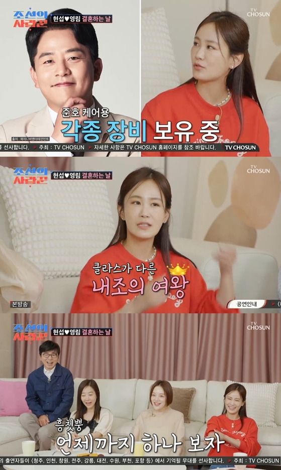 조선의사랑꾼/사진=TVCHOSUN캡처[스포츠투데이정예원기자]'조선의사랑꾼'정영림이남편심현섭에대한애정을과시했다.19일방송된TVCHOSUN예능'조선의사랑꾼'에서는방송인심현섭과신부정영림의결혼식현장이공개됐다.조선의사랑꾼/사진=TVCHOSUN캡처두사람은결혼식당일이른아침부터샵에들러헤어와메이크업을받았다.심현섭은"서울에일하러가면(정영림이)'사진찍어서보내봐요.오빠무슨옷입었는지'라고하더라"며"한번도간섭을안받고살았는데이젠이해가된다.나때문에코털깎이도갖고다니더라"고밝혔다.스튜디오에서이를보던김지민은"영림씨가나와비슷하다"며"난지금거의간병인이라고봐도될것같다.새치염색커버까지들고다닌다"고말해웃음을자아냈다.정영림은"왜심현섭과결혼을하기로했냐"는질문에"그냥자연스럽게된것같다.나도생각을해봤는데오빠의자상함,따뜻함때문에점점스며든것같다"며"날항상웃게해준다.오빠랑있을때내가가장나다운것같다"고말했다.이어"방송에서보이는모습만보면결혼을안하려고했을것이다.내가하려는이유가있다"고덧붙였다.또한"혼수를본인이다했다고들었다"는제작진의말에"오빠한테계산적이고싶지않다.그냥다해주고싶었다.뭘해줘도아깝지않다"고답했다.[스포츠투데이정예원기자[email protected]]Copyright©스포츠투데이.무단전재및재배포금지.