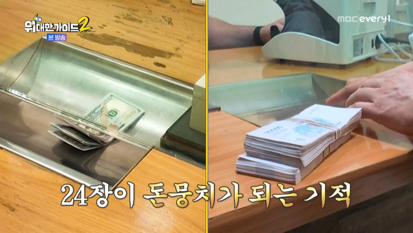 MBC에브리원‘위대한가이드2’캡처MBC에브리원‘위대한가이드2’캡처[뉴스엔장예솔기자]'위대한가이드2'박명수가돈다발을손에넣었다.5월13일방송된MBC에브리원'위대한가이드2'에서는박명수,최다니엘,이무진의아르헨티나여행기가공개됐다.이날박명수,최다니엘,이무진은위조지폐피해를방지하기위해공식환전소에서안전하게돈을바꾸기로했다.안쪽에깊이위치한환전구역.세사람은1인당800달러씩총2400달러를모두환전했다.앞서박명수는아프리카르완다여행당시환전후엄청난돈다발을받아당황했던바.박명수는"여기도한보따리줄것같다"며두려워했고,실제로돈다발이당첨돼웃음을자아냈다."돈갖고다니려면불안해미치겠다"며조심스레가방에돈을넣은박명수는주변을힐끔거리더니"저카메라감독이의심스럽다"고너스레를떨었다.뉴스엔장예솔imyesol@기사제보및보도자료[email protected]ⓒ뉴스엔.무단전재&재배포금지Copyright©뉴스엔.무단전재및재배포금지.