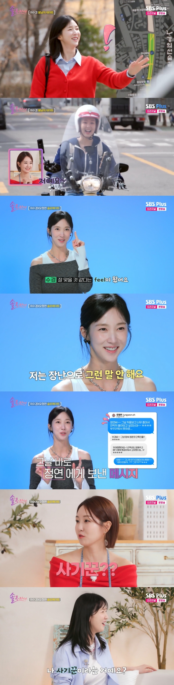 사진=SBSPlus·E채널[스포츠투데이김태형기자]이수경이첫만남에오정연에게디엠(DM)을보냈다고밝혔다.13일방송된SBSPlus·E채널'솔로라서'에는이수경과오정연의데이트가그려졌다.이날이수경은길에서누군가를기다리는중이었다.이때스쿠터를몰고오정연이나타났다.이수경은"(데이트상대는)오정연"이라며"저는저를믿는다.잘맞을것같다는필(느낌)이왔다"고말했다.지난첫만남에서이수경은오정연에게"같이살래요?","같이식기보러갈까?","우리는같이살아야돼"등플러팅을한바있다.이수경은"저는장난으로그런말안한다.그날바로디엠(DM)도보냈다"고밝혀눈길을끌었다.황정음은"이정도면고백이야"라고반응했다.오정연은"이정도로적극적인사람은사기꾼빼고없었던것같다"고말했다.이수경은"나사기꾼이라는거예요?"라고발끈해웃음을자아냈다.오정연은이수경에게헬멧을건네며스쿠터뒷자리에태웠다.이수경은"나남자뒤에도안타봤는데여자뒤에타야되는거야?"라며오정연의허리를꽉껴안았다.그는"느낌이뭔가새롭더라.이게맞나싶은데놓치면또무섭고심쿵포인트가있는것같다"고말했다.오정연은"언제봤다고백허그를너무와락해버리시니까"라며웃었다.뒷자리에누구를태워본적있냐는질문에는"전남친?"이라고답해눈길을끌었다.황정음은"저도얼마전에정연언니가태워줬다.너무좋았다.심지어헬멧씌워주고할때는자상해서심쿵했다"고밝혔다.이에이수경은"뒤에자꾸여자태우네"라고질투했고,오정연은"다들그렇게타고싶대"라고너스레를떨었다.[스포츠투데이김태형기자[email protected]]Copyright©스포츠투데이.무단전재및재배포금지.