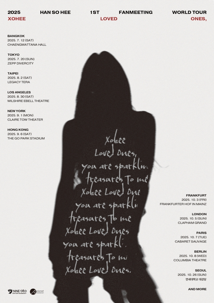 배우한소희가월드투어팬미팅개최도시를공개했다.iMBC연예뉴스사진소속사9아토엔터테인먼트는14일오후공식SNS채널을통해‘2025HANSOHEE1stFANMEETINGWORLDTOUR[XoheeLovedOnes,](2025한소희퍼스트팬미팅월드투어[소희러브드원즈,])’의투어맵포스터를오픈하며글로벌팬들과의만남을본격예고했다.이번월드투어팬미팅은오는7월12일방콕을시작으로도쿄,타이베이,로스앤젤레스,뉴욕,홍콩,프랑크푸르트,런던,파리,베를린등아시아와미주,유럽전역을순회한뒤,오는10월26일서울연세대학교대강당에서대미를장식할예정이다.특히포스터하단에는‘ANDMORE’라는문구가함께담기며,아직공개되지않은추가도시일정이추후발표될예정임을암시해팬들의기대감을더욱높이고있다.공개된포스터에는한소희의실루엣위로“XOHEELovedOnes,youaresparklingtreasurestome”라는문장이반복되어적혀있어시선을사로잡는다.이는팬들을‘빛나는보물’로표현한메시지로,이번팬미팅투어를통해한소희가전하고자하는진심이고스란히담겨있다.한소희는2017년드라마‘다시만난세계’로데뷔한이후‘부부의세계’,‘알고있지만,’,‘마이네임’,‘사운드트랙#1’등다양한작품을통해폭넓은연기스펙트럼과독보적인존재감을입증해왔다.특히넷플릭스‘경성크리처2’에서는강렬한액션과섬세한감정연기를동시에선보이며글로벌인지도를더욱높였다.한편,한소희의월드투어팬미팅과관련된자세한사항은추후공식SNS채널및팬소통플랫폼하이앤드를통해공개될예정이다.iMBC연예유정민|사진출처9아토엔터테인먼트Copyright©MBC연예.무단전재및재배포,AI학습금지.