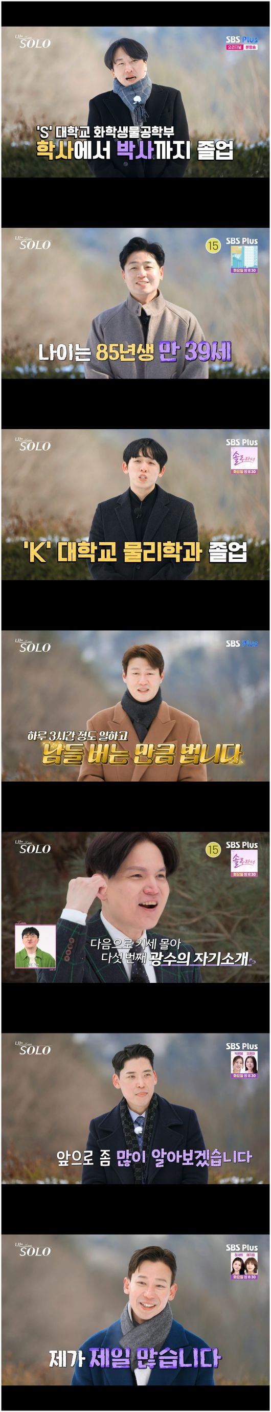 [OSEN=오세진기자]‘나는솔로’남성출연자들의스펙이공개됐다.7일방영된SBS예능‘나는솔로’(이하‘나는솔로’)에서는골드미스&미스터특집이시작되었다.45세영수는“저는부산에서왔습니다.일단서울대화공과박사학위까지따고,미국조지아텍이랑예일에서연구원생활을하다가이제한국들어와서햇수로는11년째부산소재공과대학교에서교수로재직중이다”라며엄청난스펙을공개해주목을받았다.가장큰인기를누리는영호는85년생39세였다.그는“인천시청7년차공무원이다.저를어떻게표현할까하다가,장점이너무많아서세가지만추리겠다.일단인기가많다.남중,남고,공대를다니니까친구대부분남자다”라면서비흡연자라고밝혀시선을끌었다.엄청난동안을자랑한영식은올해마흔살로,“학교는고려대학교물리학과나와서,직업은게임개발자다.직장과집모두판교에있다”라고말해시선을끌었다.커다란덩치를자랑한영철은“영식이랑동갑이다.키는193cm정도다.운동선수로아실테지만,저는서예전공자다.직업은캘리그라피다.큰글씨쓰는공연도하고있다”라고말했다.독특한매력을뽐내는광수는83년생41세로,“대기업건설부문이라크지사에서근무중으로,해외영업만12년째다”,“저는사우디아라비아에서유년생활을했다.거기서국제학교를졸업해서영어와아랍어가가능하다”라며자신을소개했다./[email protected][사진]SBS예능‘나는솔로’방송화면캡처Copyright©OSEN.무단전재및재배포금지.
