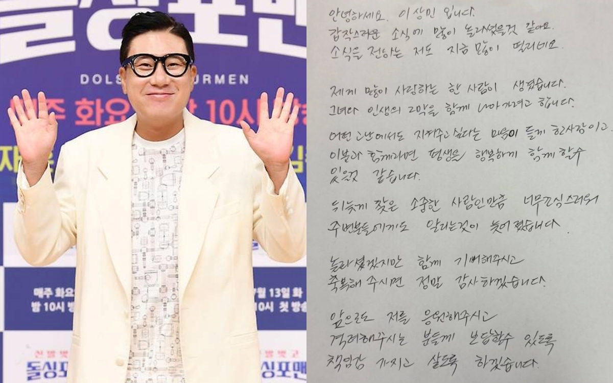 사진=SBS,이상민SNS그룹'룰라'출신방송인이상민(51)이재혼소감을자필편지로전했다.이상민은지난달30일자신의인스타그램을통해손편지로재혼을발표했다.그는"갑작스러운소식에많이놀랐을것같다.소식을전하는나도지금많이떨린다"고밝혔다.이어"내게많이사랑하는한사람이생겼다.그녀와인생의2막을함께나아가려고한다"며"어떤고난에서도지켜주고싶다는마음이들게한사람이고,이분과함께라면평생을행복하게함께할수있을것같다"고썼다.그러면서"뒤늦게찾은소중한사람인만큼조심스러워주변분들에게도알리는것이늦어졌다.놀랐겠지만함께기뻐해주고축복해주면정말감사하겠다.앞으로도응원해주고격려해주는분들께보답할수있도록매순간더책임감가지고살겠다"고덧붙였다.이상민은여름께연하의비연예인과결혼한다.배우이혜영(53)과이혼한지20년만이다.코미디언김준호(49)·김지민(40)결혼날인7월13일보다빨리예식을올릴전망이다.이날SBS는30일"다음달11일오후8시55분'미운우리새끼'에서관련내용을방송한다"고알렸다.미우새와'신발벗고돌싱포맨'하차여부관련해선"향후출연은아직논의된바없다"고했다.이상민은2004년이혜영과10년끝에결혼했으나,이듬해이혼했다.둘사이자녀는없다.1994년룰라로데뷔했으며,'샤크라''샵''컨츄리꼬꼬'등의프로듀서로활약했다.사업가로변신했지만,2005년11월부도로빚69억8000만원을졌다.지난해미우새에서빚을모두청산했다고밝혔다.JTBC'아는형님',MBN'알토란',KBS조이'차트를달리는남자'등에도출연중이다.한편한편이상민은지난해'미운우리새끼'에서재혼계획이있냐는물음에"아직얘기할단계는아니지만,새로운사람과만나는건아닌것같다"며"알던사람중에서…"라고했다.이어"내가연애하도록마음을여는순간뭔가끓어오르더라"면서흠모하는이성상대가있음을간접적으로전했다.그러면서"아직뭐단계가진행되지않았다.내마음속계획이섰다"고말한바있다.한윤종기자[email protected]©세계일보.무단전재및재배포금지.