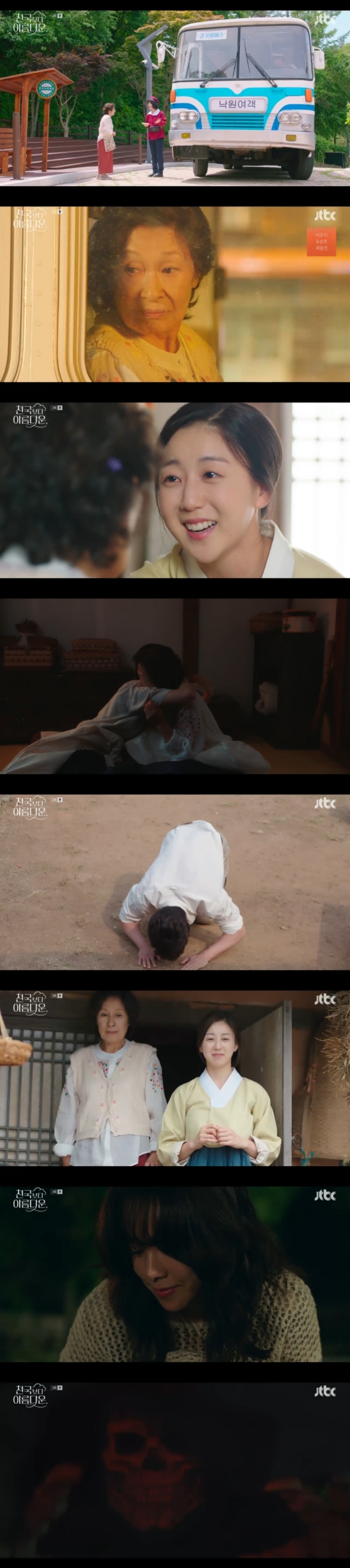 사진=JTBC[스포츠투데이김태형기자]김혜자가과거로돌아가어머니와재회했다.한지민에게정체불명의해골이달려들어위기를예고했다.26일방송된JTBC토일드라마'천국보다아름다운'3회에는이해숙(김혜자)이엄마를찾아나선모습이그려졌다.이날고낙준(손석구)이솜이(한지민)의지옥행을막았던장본인임이밝혀졌다.그는솜이에대해"나도모르게눈길이가고신경이쓰였다"고말했다.이말이이해숙의분노를샀다.이해숙은"나는늙고쟤는젊고예뻐서신경쓰였냐"며속마음을표출했고,솜이는냉큼"맞아요.여전히예쁘세요할머니"라고대꾸했다.이후센터장(천호진)에게교화수업을받는중에도이해숙은"내가돌아왔을때저애가내눈에안보이길바란다"고경고했다.하지만고낙준은솜이를내쫓지못했다.화가난이해숙은자신을붙잡는고낙준에게"신경꺼.내가당신아니면갈데가없을것같아서그래?그만해.살아서그만큼지냈으면됐지"라고말했다.이어"이제나없이도잘살수있게됐잖아.다시남들처럼살아보고싶어서이모습택한거아니야당신?내모습에맞춰서당신도그렇게살라는거욕심이야.난나한테맞는삶을찾아서갈테니까"라며고낙준의손을뿌리쳤다.그렇게이해숙은천국지원센터를찾아어머니한경자를찾아달라고부탁했다.직원은"다행히천국에계신다"며"알수는있는데그쪽분이원하셔야주소를알려드릴수있다.절차가있어서시간이걸린다"고답했다.이후이해숙은천국버스를타고어머니가있는1950년대과거로향했다.그곳에서젊은시절어머니와재회했다.극말미이해숙은어머니로부터자신이과거아버지가바람을피운첩의딸이었다는이야기를듣게됐다.아버지와첩이사고로세상을떠난뒤,지금의어머니가어린이해숙을거둔과거가드러났다.두사람은서로를부둥켜안고울었다.이해숙을데리러찾아온고낙준은"어머니.처음인사드리겠습니다.고서방입니다.절부터올리겠습니다"라며절을올렸다.고낙준과함께집으로돌아가는길,이해숙은"이것도천륜보다질긴인연이겠지"라고이야기해솜이와의관계개선을암시했다.한편홀로마당에있던솜이는뒤에서느껴진인기척에뒤를돌아봤다.검은후드를뒤집어쓴정체불명의해골이솜이에게달려드는것으로3회가끝이났다.[스포츠투데이김태형기자[email protected]]Copyright©스포츠투데이.무단전재및재배포금지.